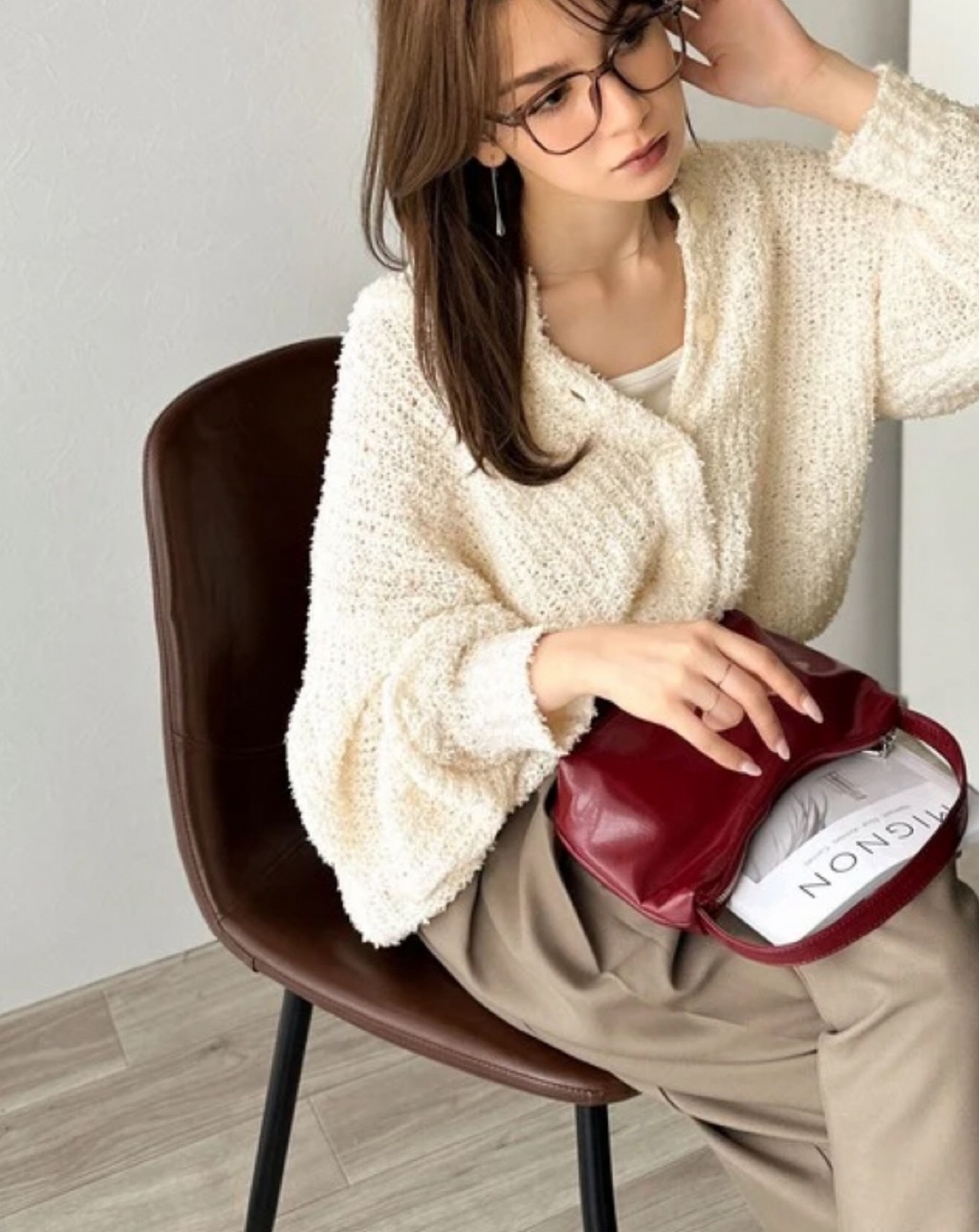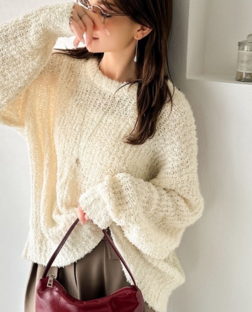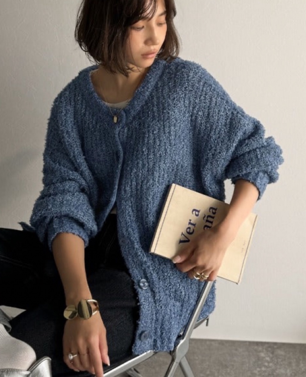 ざっくりと柔らかく編み上げられた、大人の抜け感漂うリボンヤーンカーディガン。