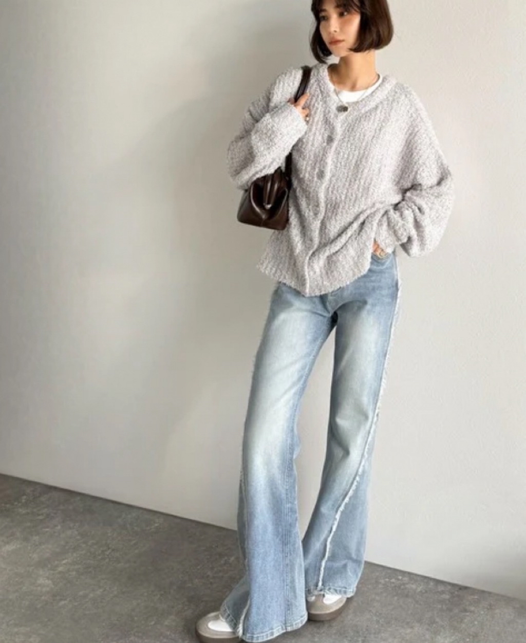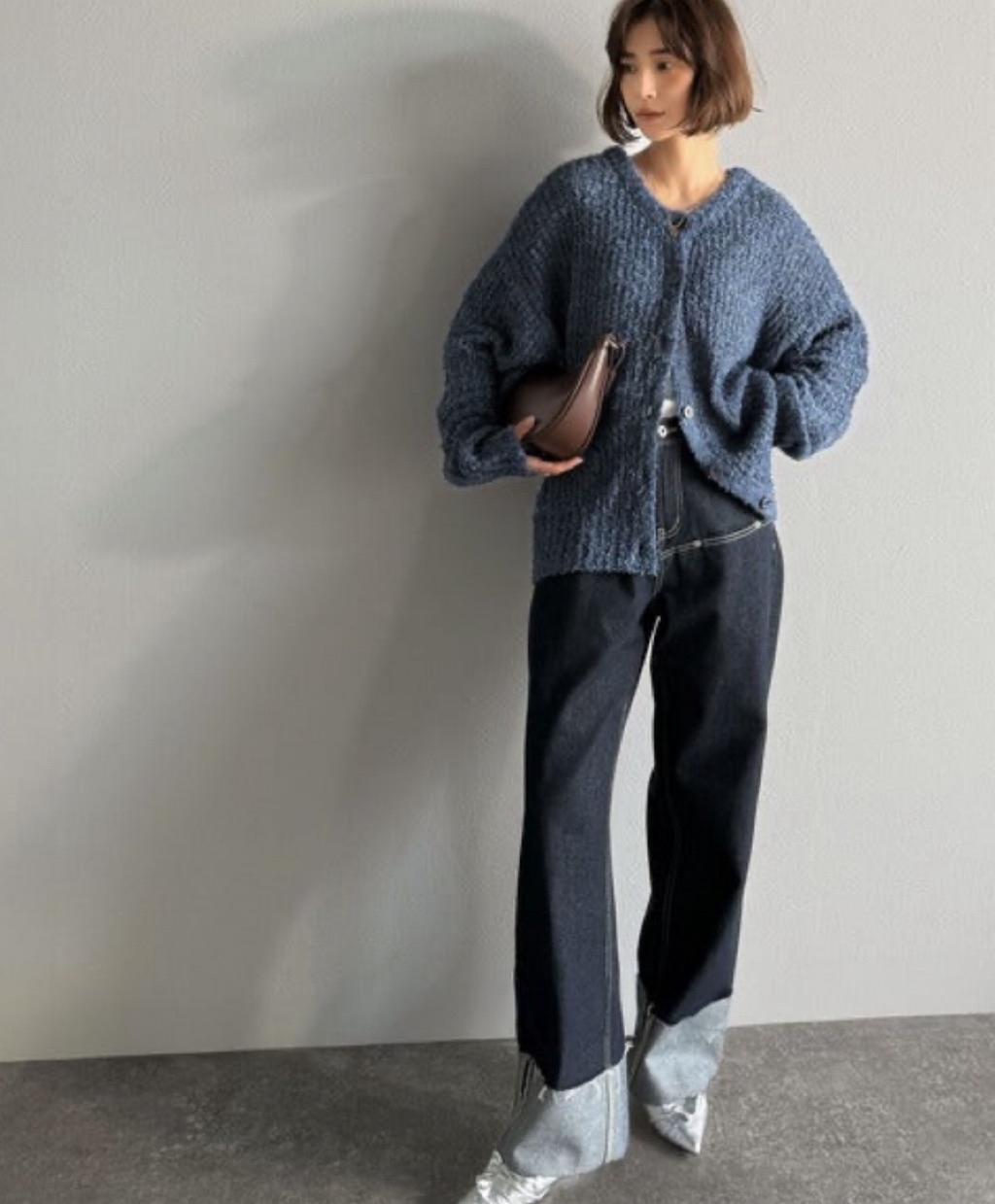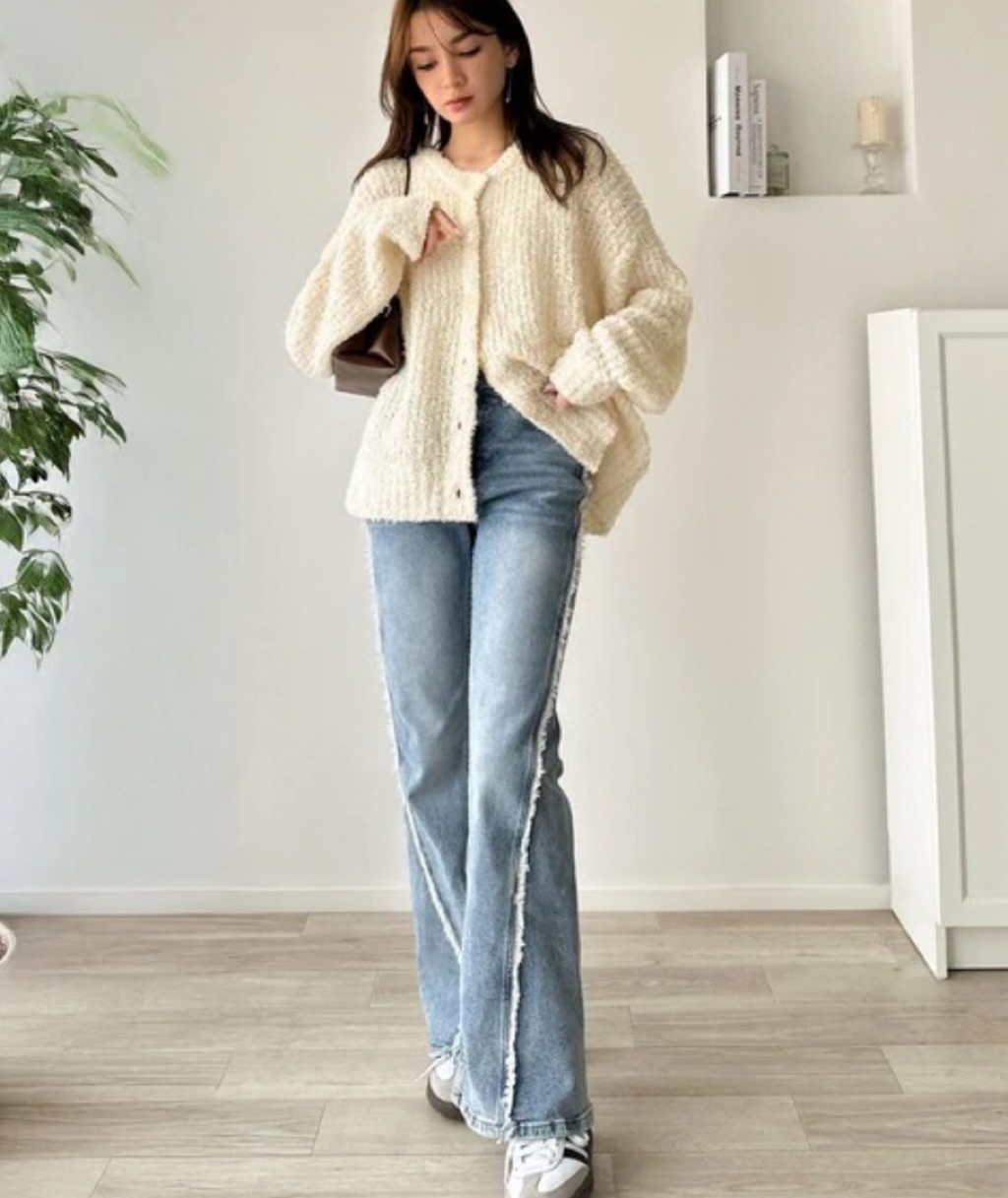 ざっくりと柔らかく編み上げられた、大人の抜け感漂うリボンヤーンカーディガン。