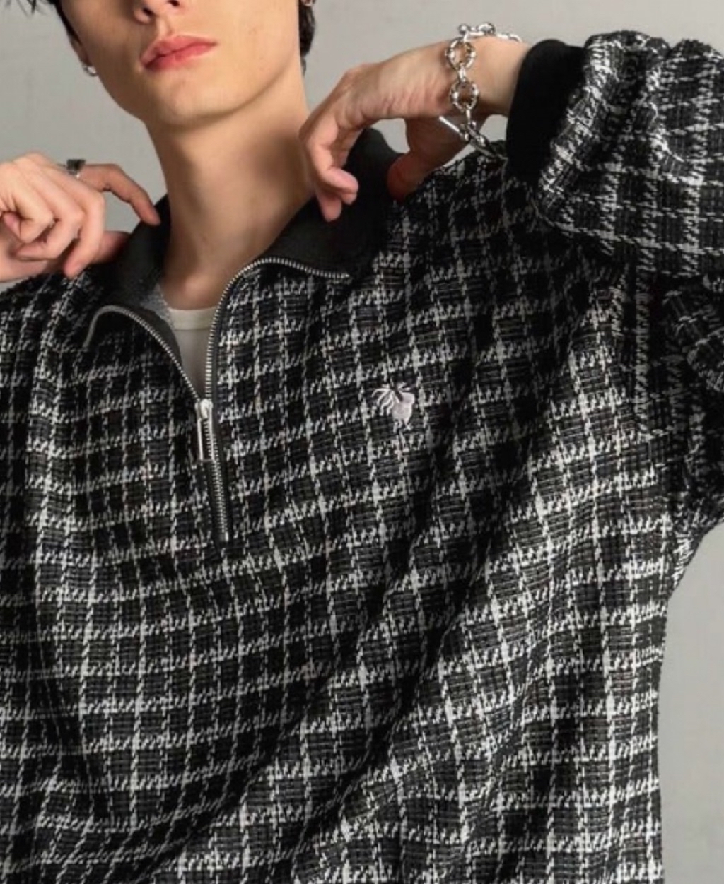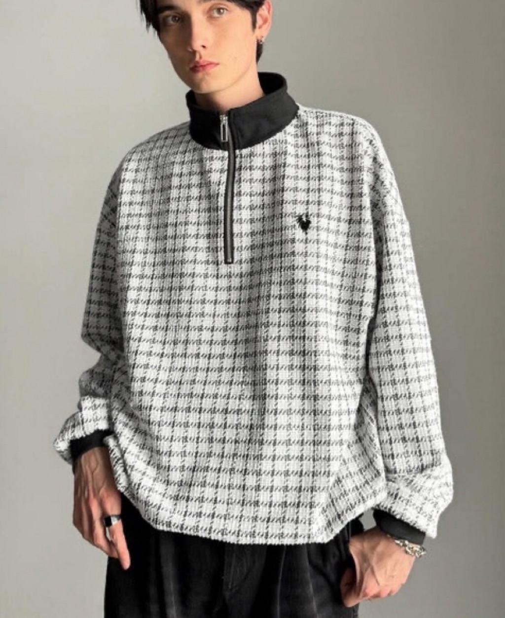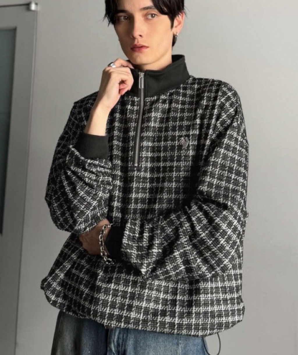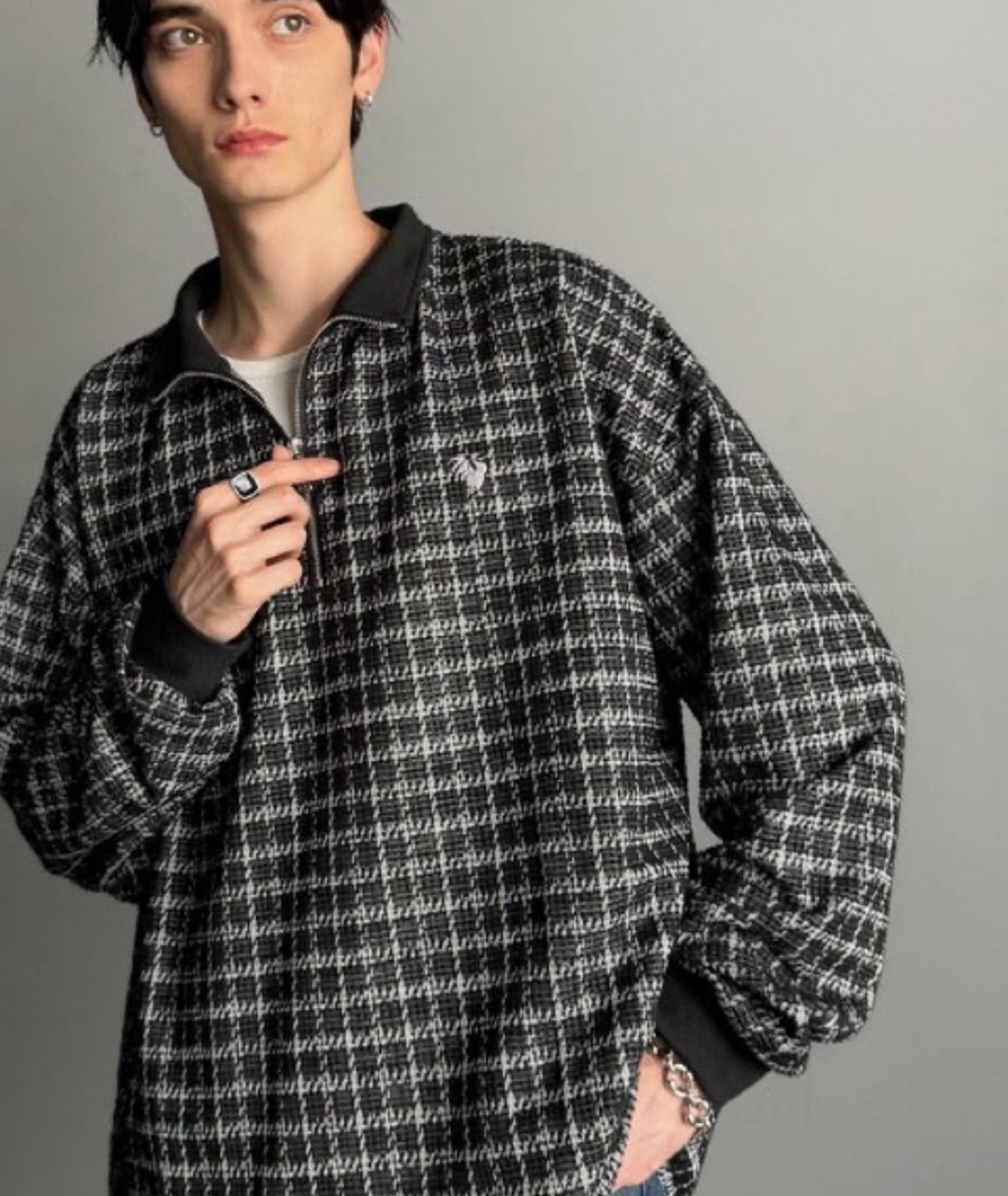 表面感のあるツイード生地を使用したハーフジッププルオーバー。