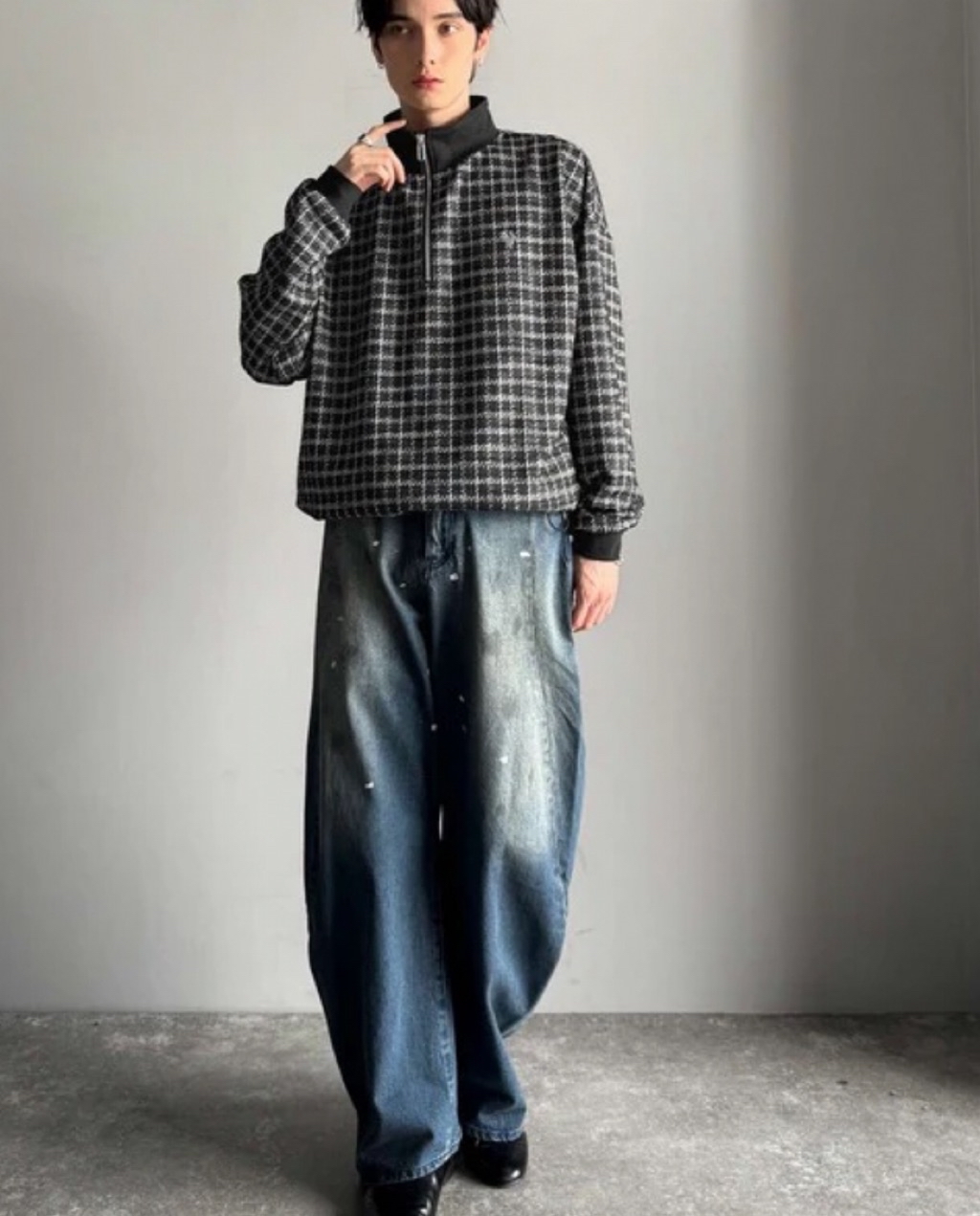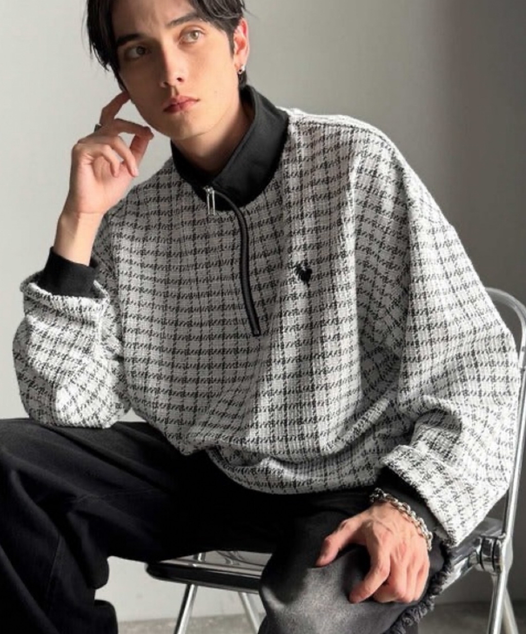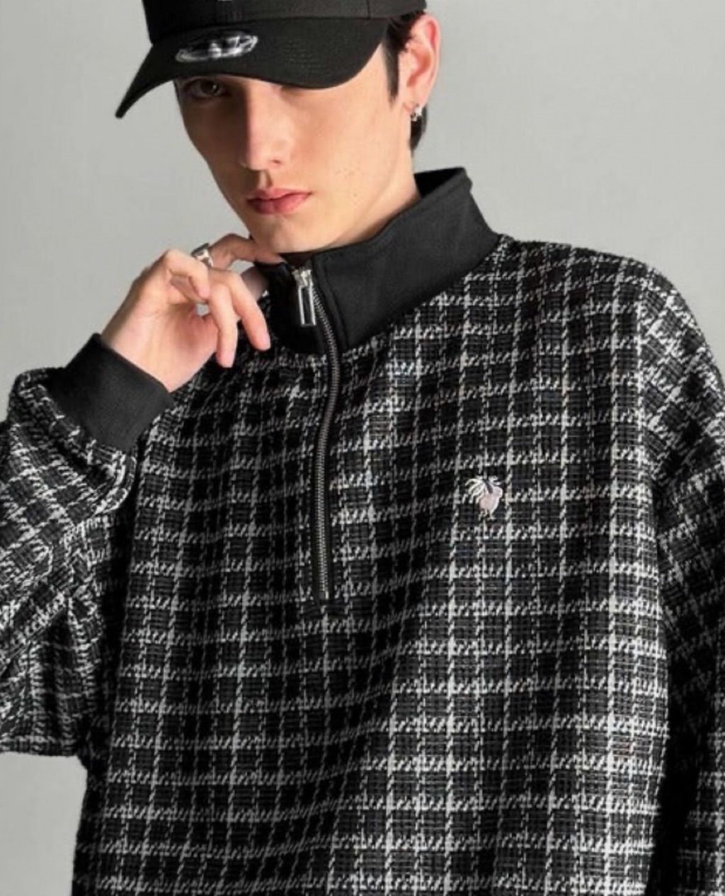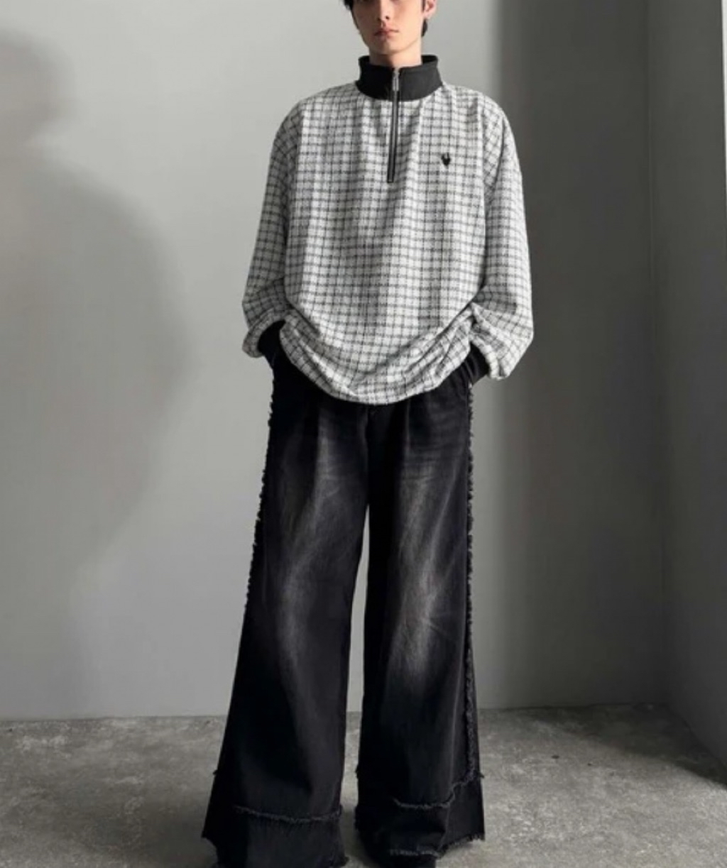 表面感のあるツイード生地を使用したハーフジッププルオーバー。