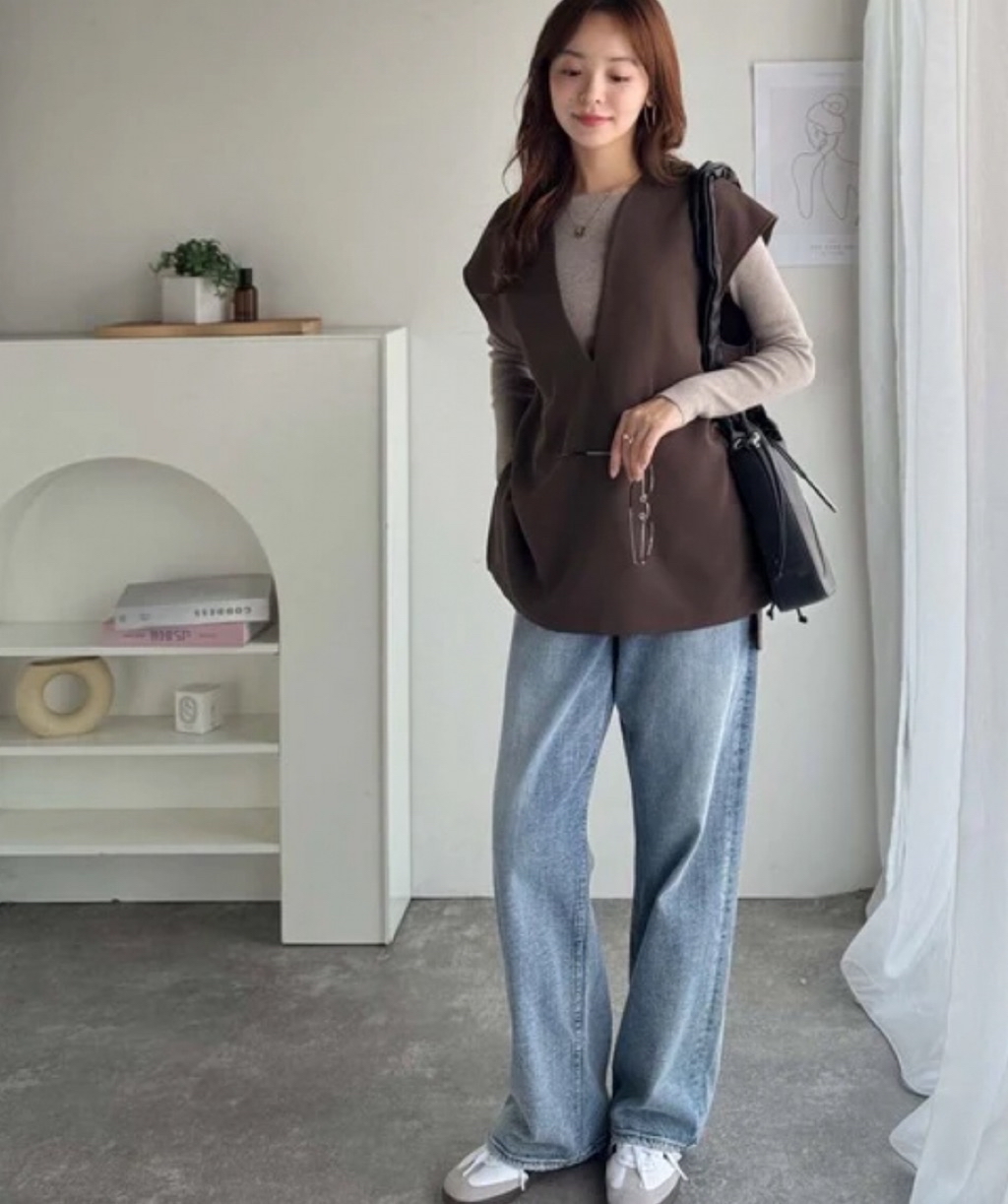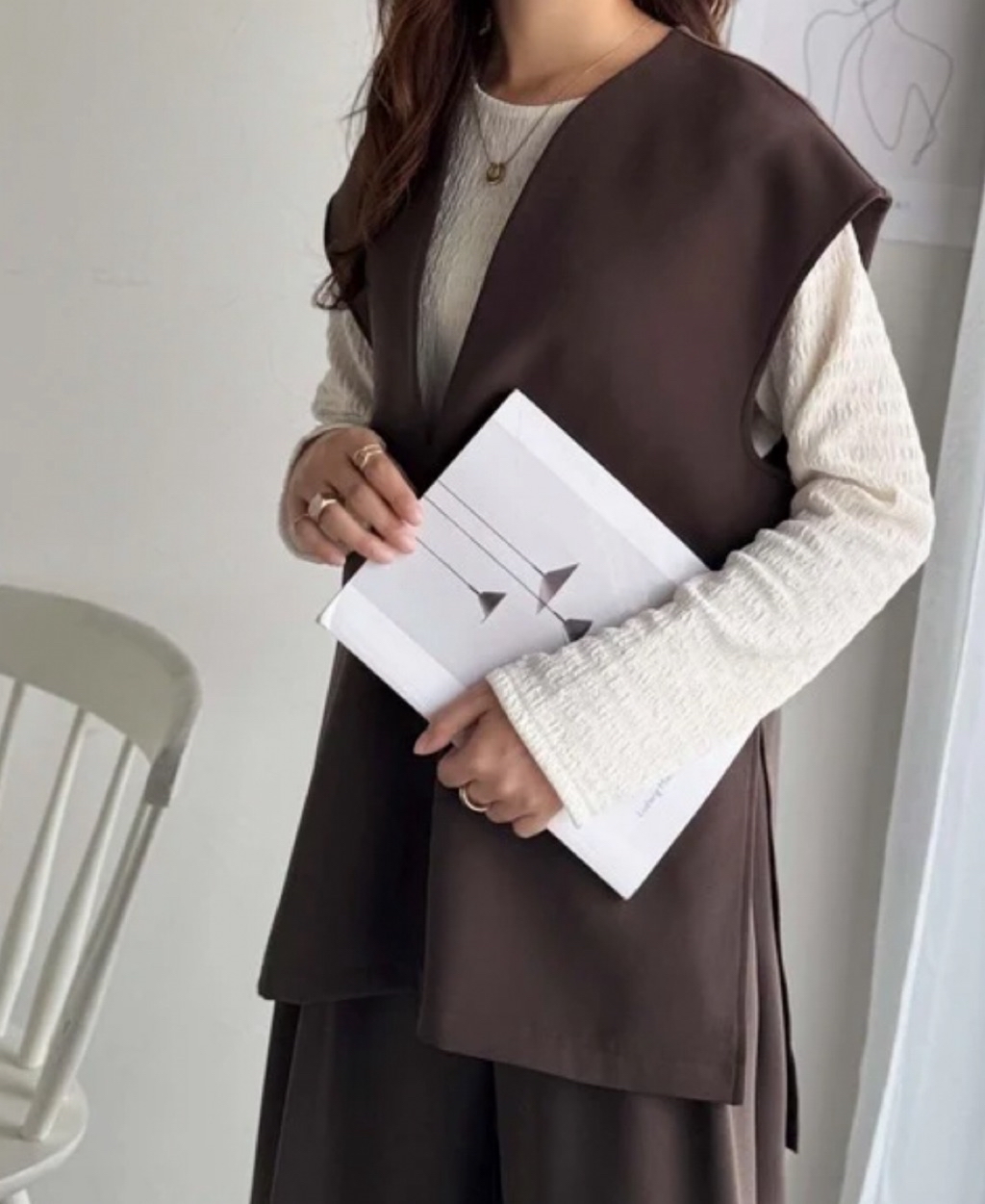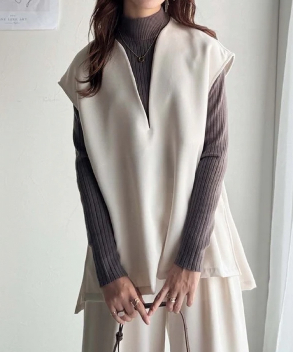衿元が深めに開いたキーネックデザインが特徴のベスト。