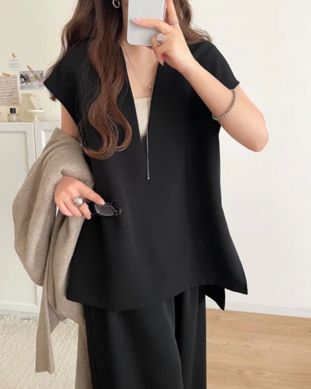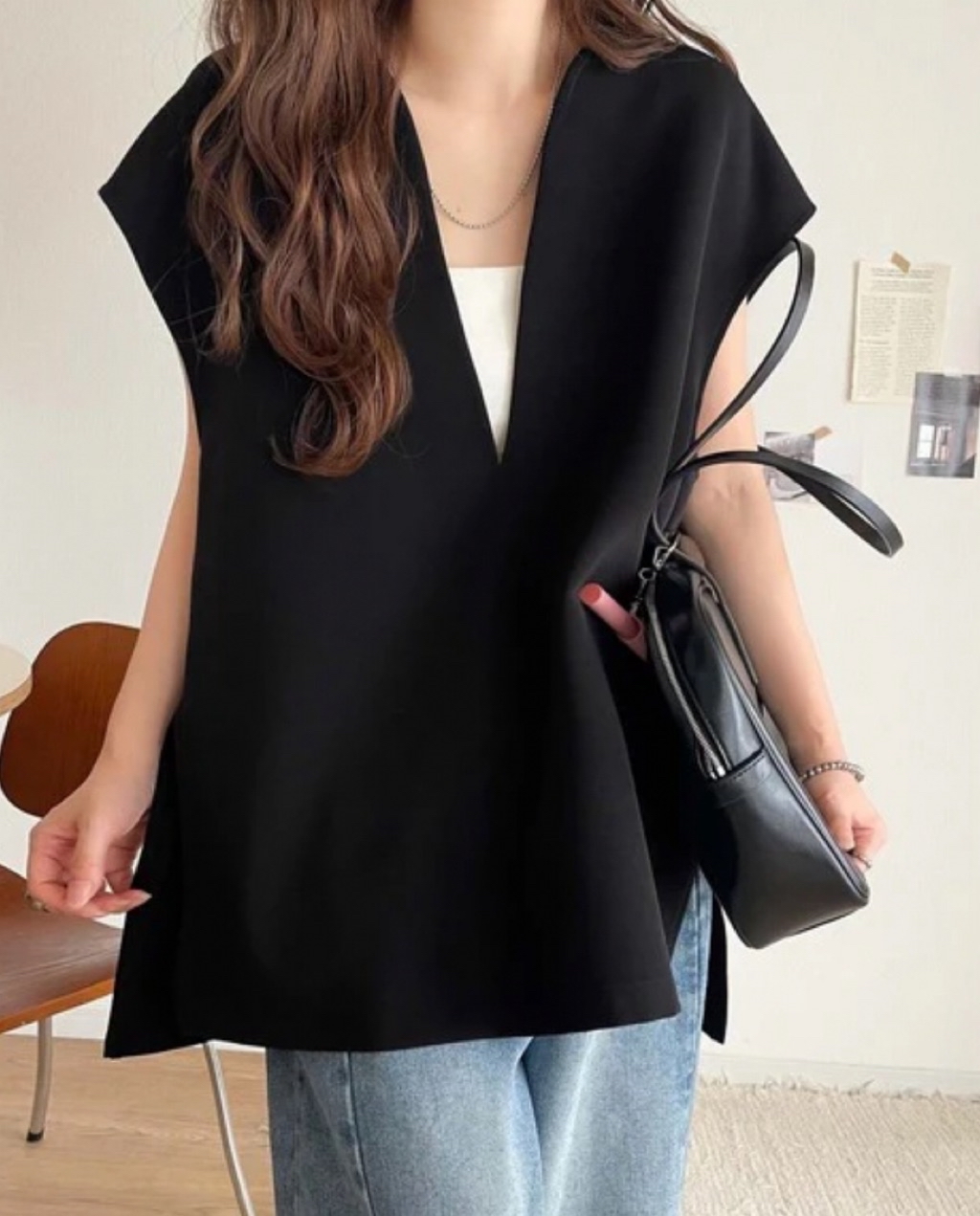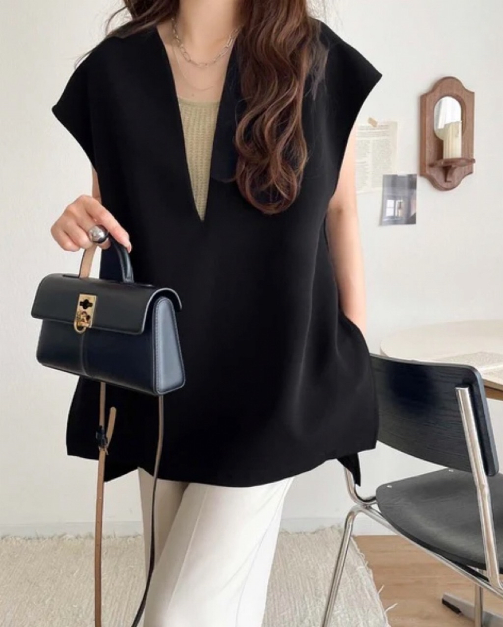 衿元が深めに開いたキーネックデザインが特徴のベスト。