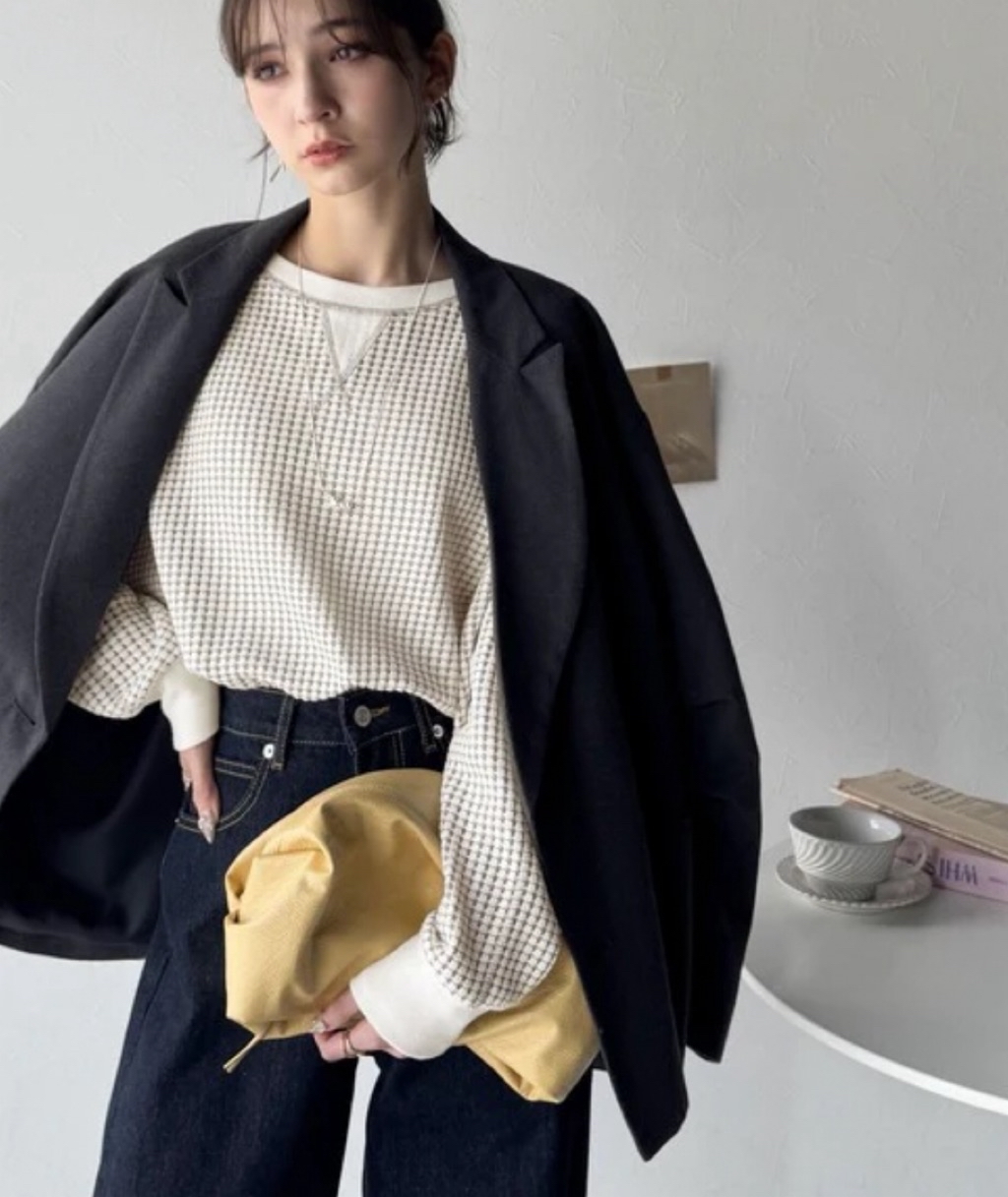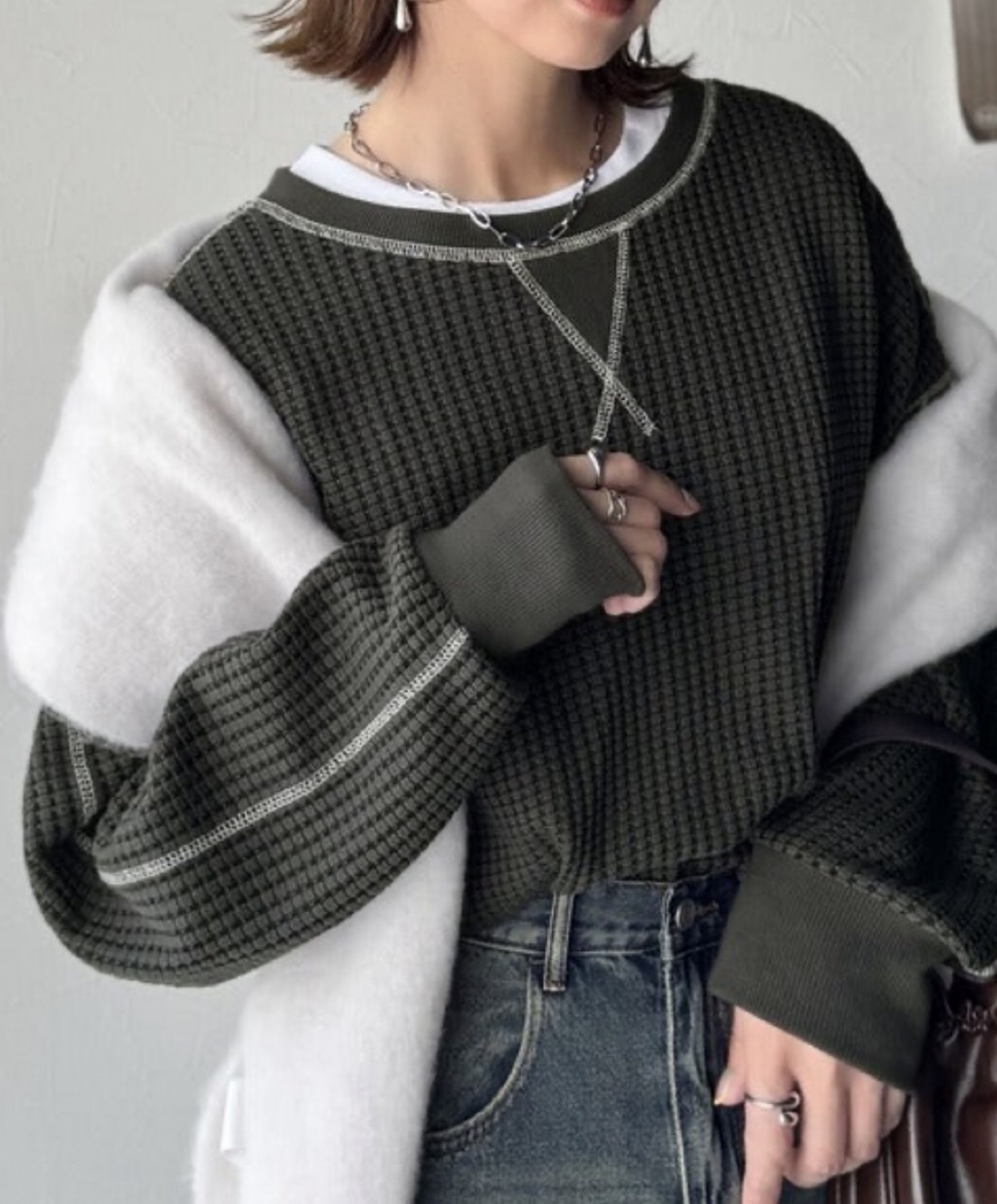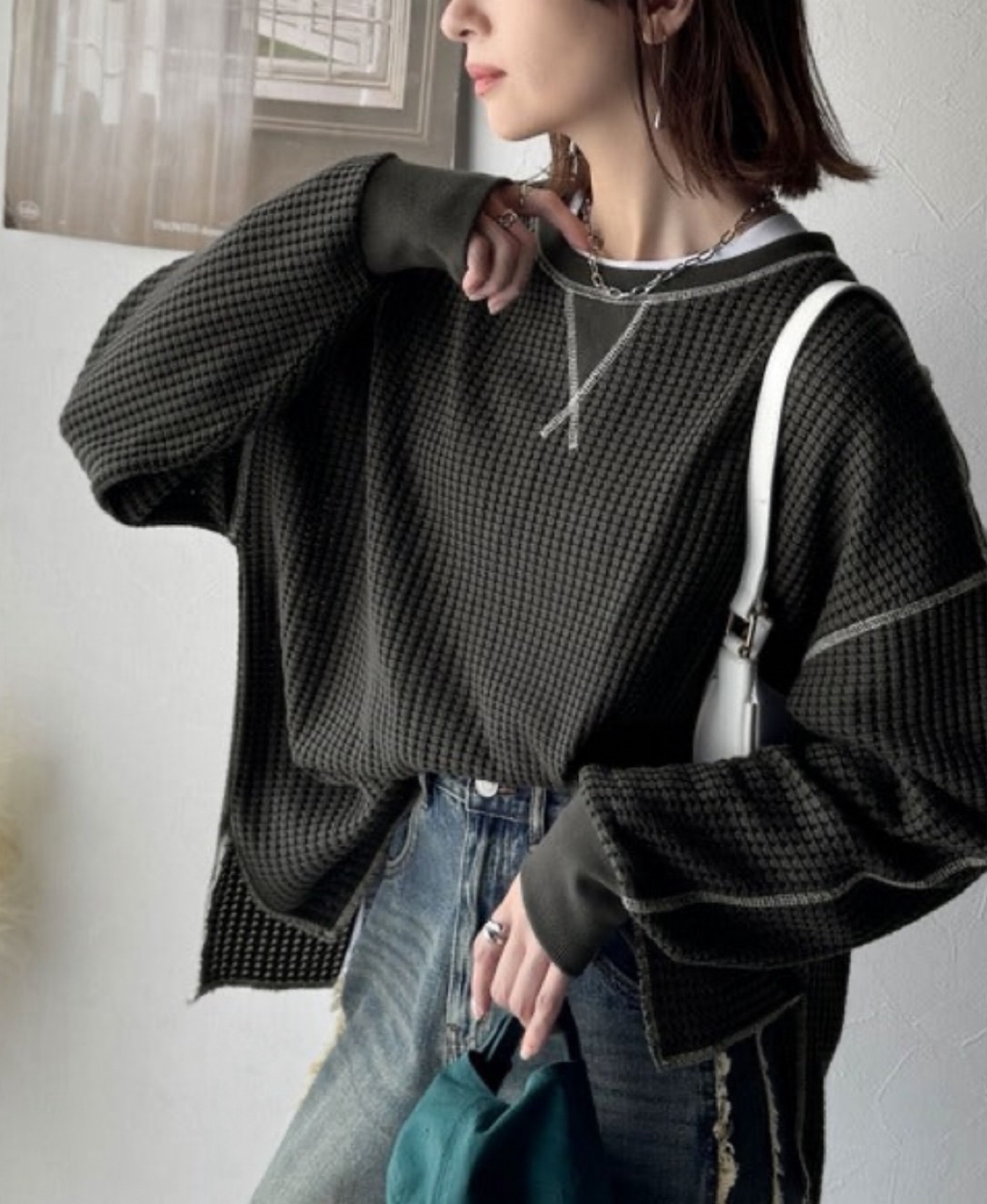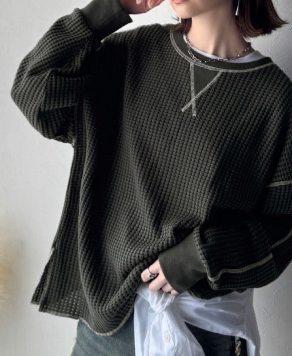 凸凹のぽこぽこした素材感が魅力的で存在感抜群なヘビーワッフルトップス。