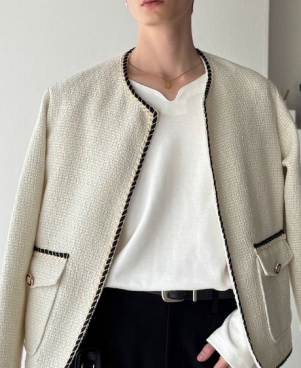 左胸のワンポイントデザインが程よいアクセントとなり、洗練された襟元が上品さを引き立てる。