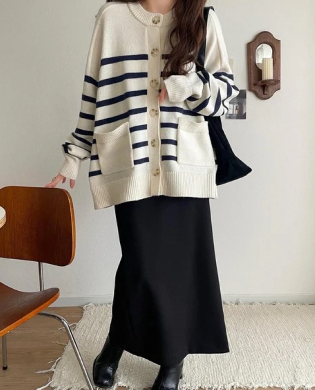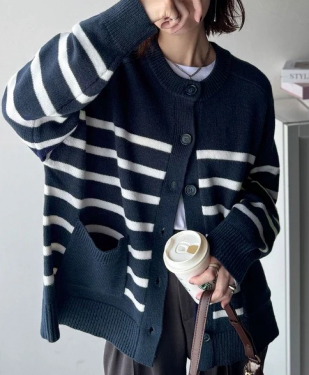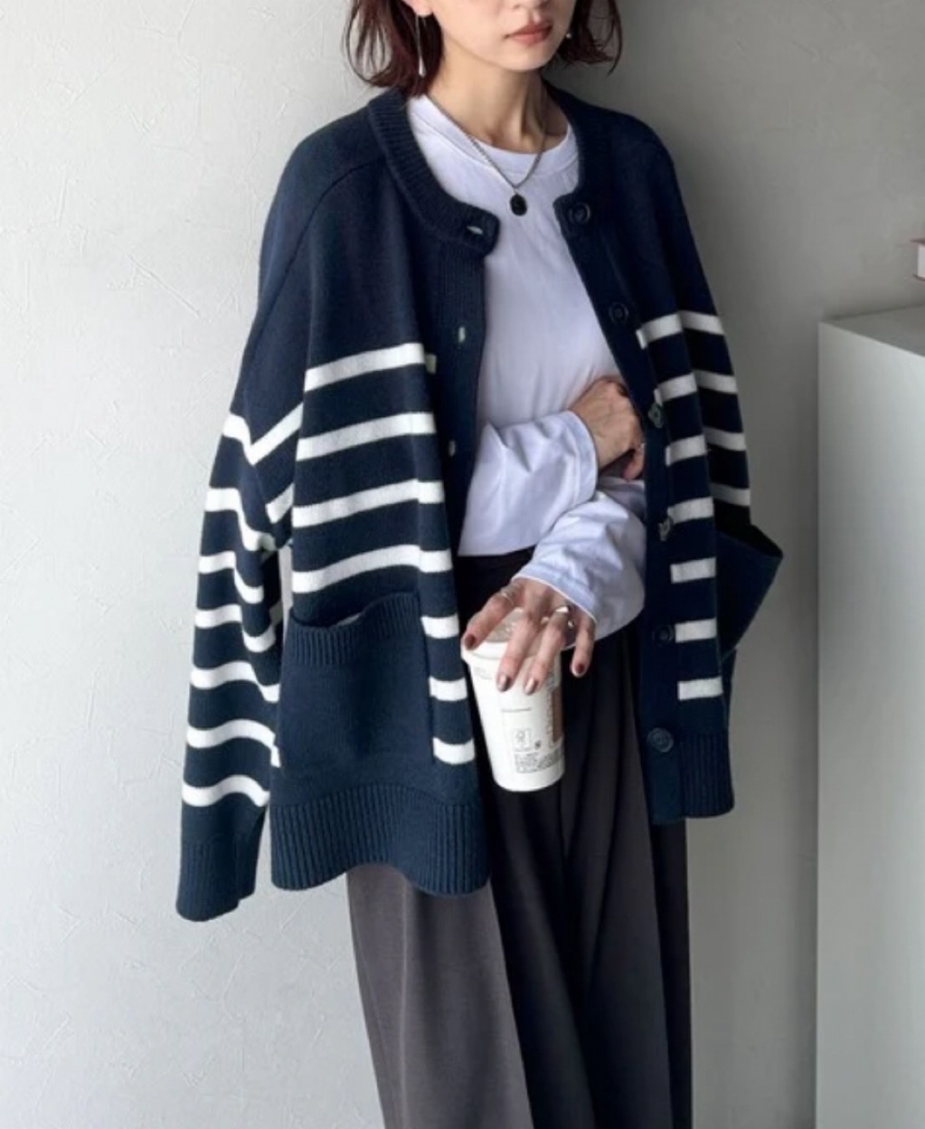 シンプルなデザインで重ね着の幅が広がるボーダーカーディガン。