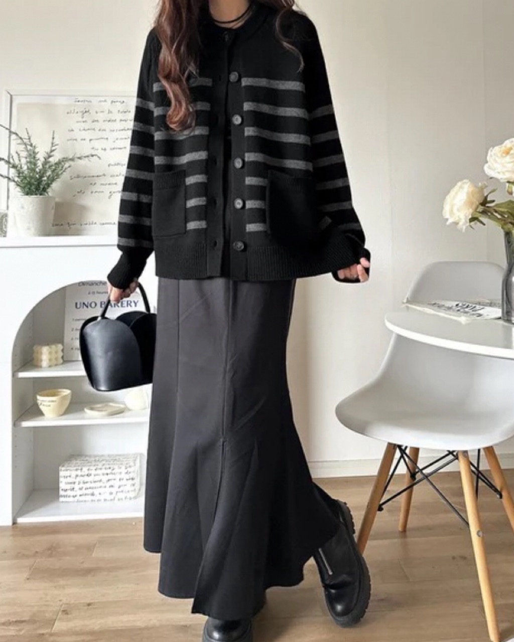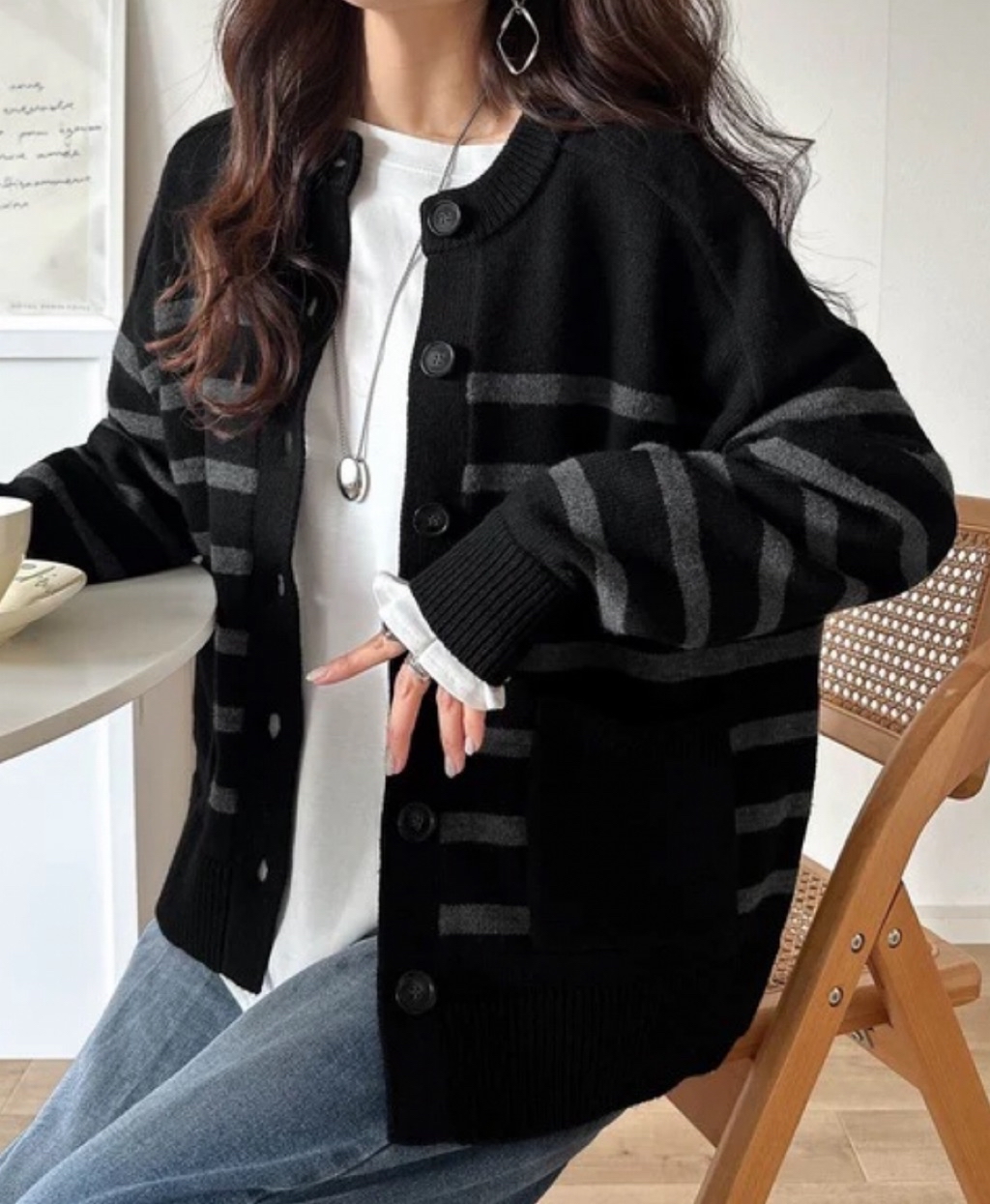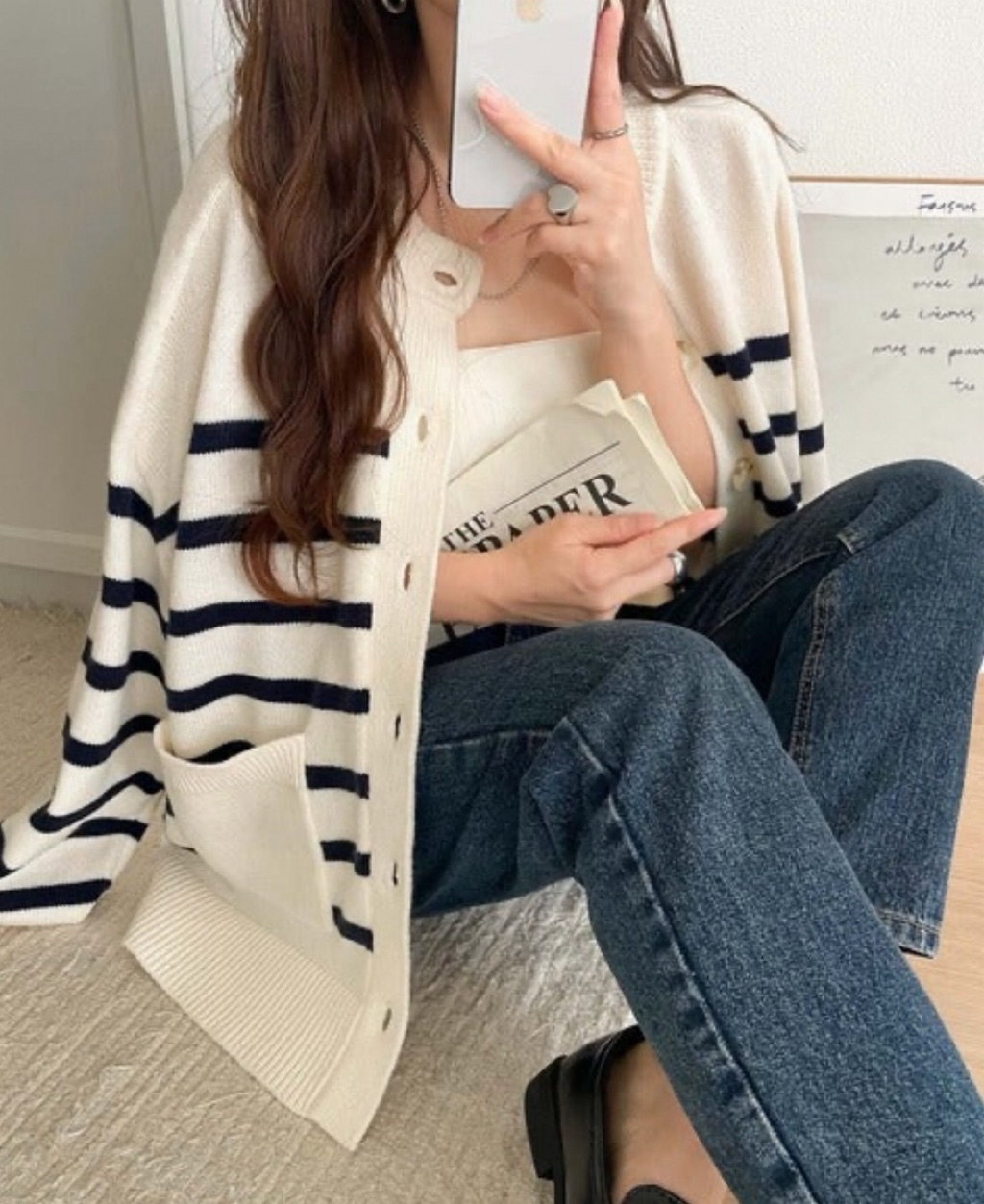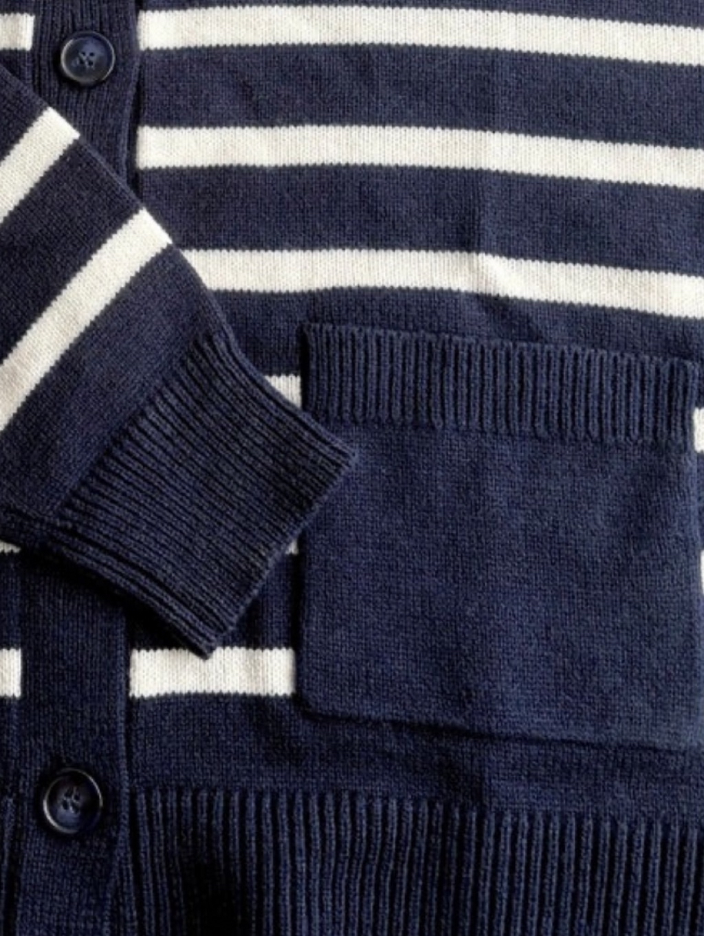 シンプルなデザインで重ね着の幅が広がるボーダーカーディガン。