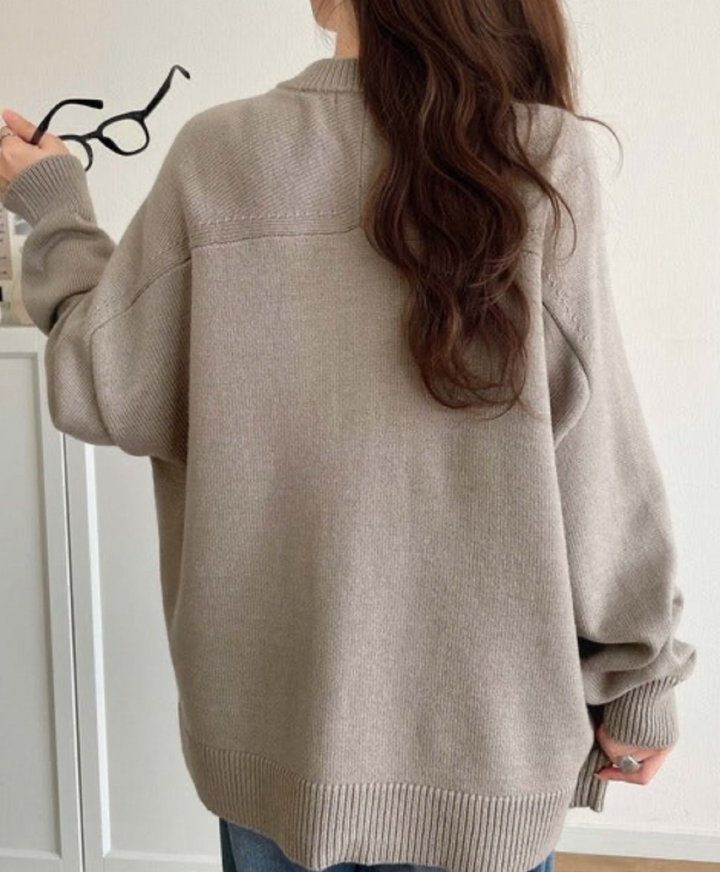軽いアウター感覚で着用でき、ゆったりとした着心地と袖のボリューム感で体のラインを拾いにくい設計。