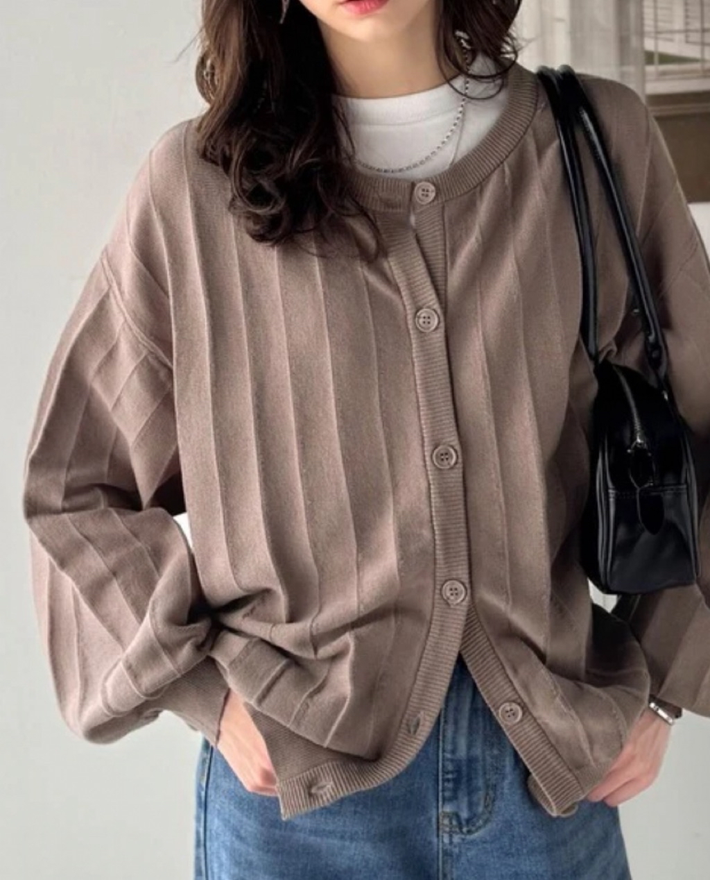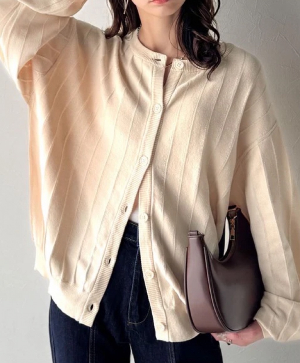 カジュアルから上品なスタイルまで、幅広く着回せるタック編みカーディガン♪