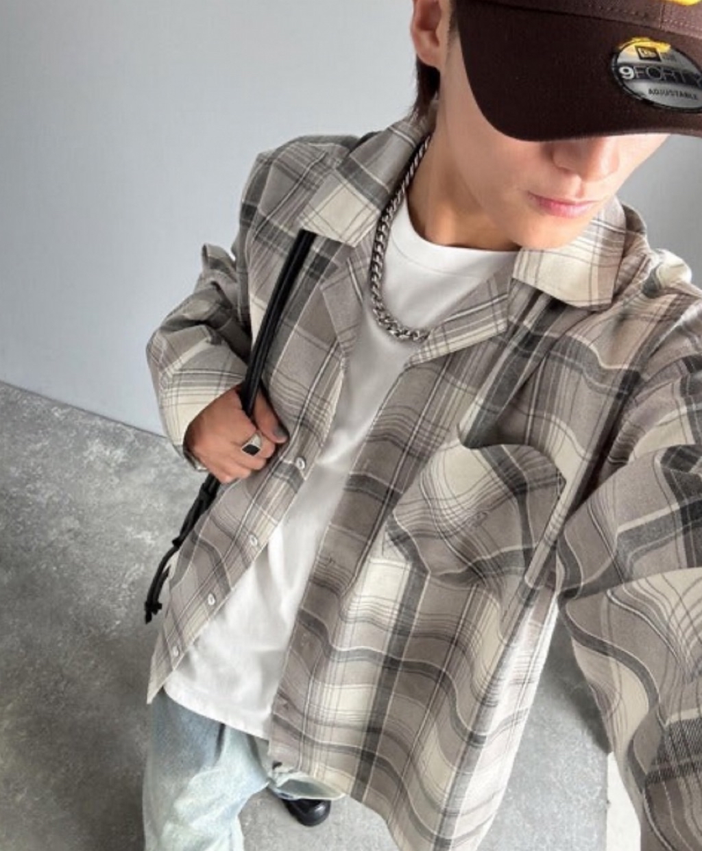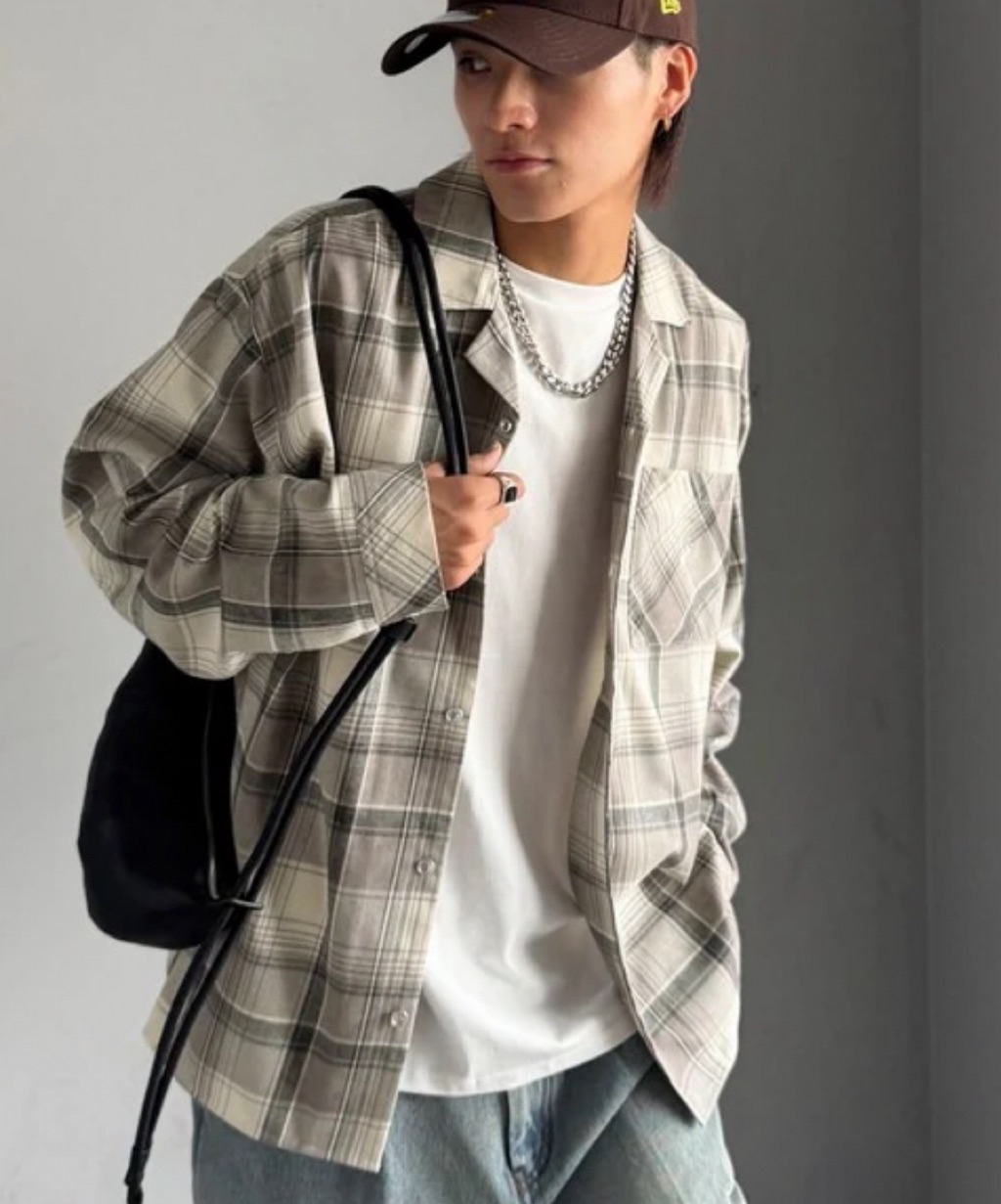 オープンカラーは首元に抜け感を与え、Tシャツやタートルネックとのレイヤードも自然に馴染むデザイン。