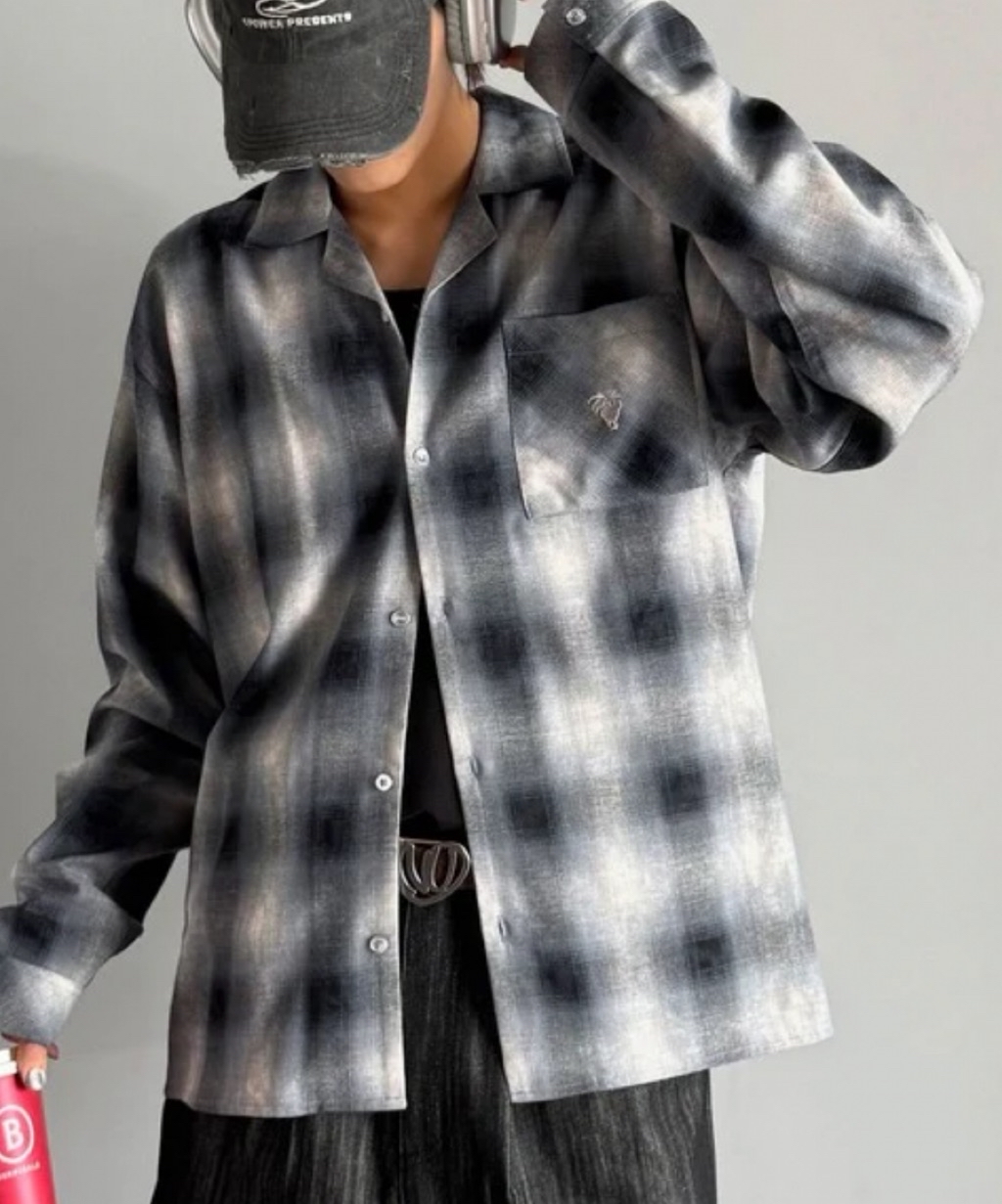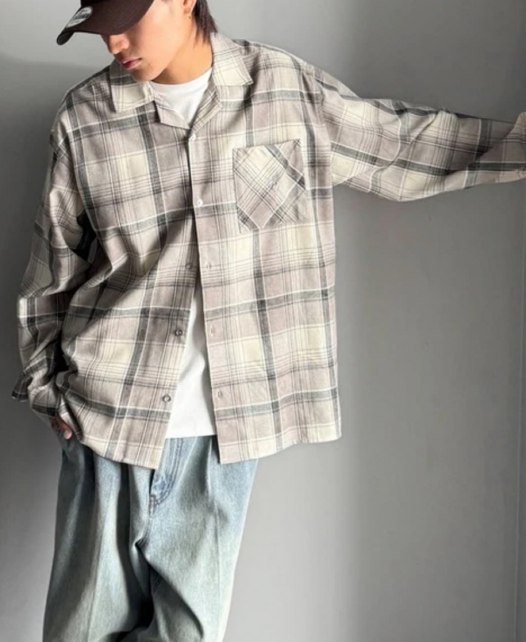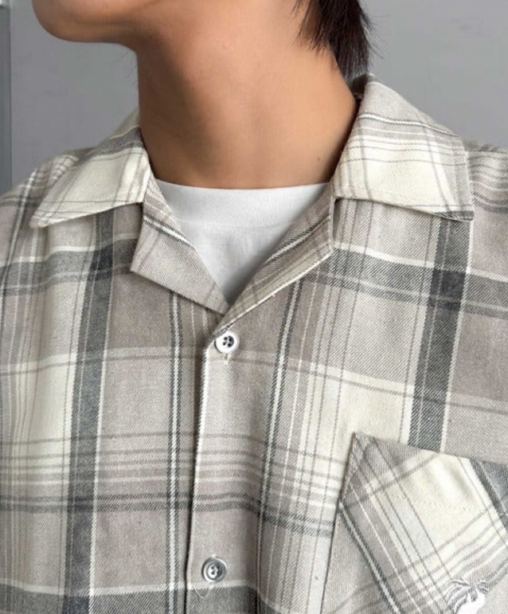 ヴィンテージ風チェック柄オープンカラーシャツ」