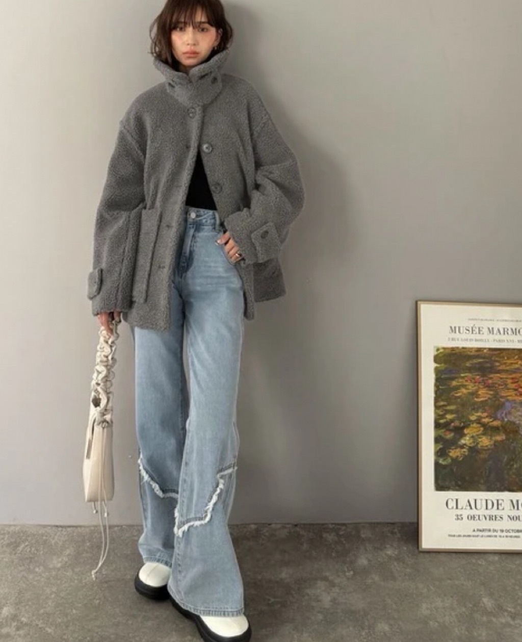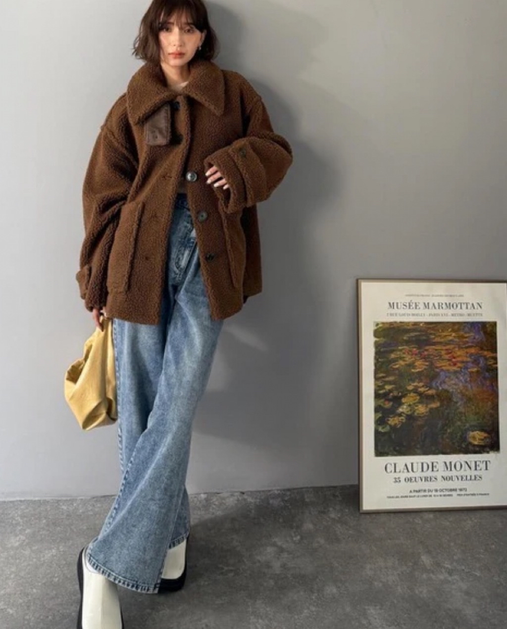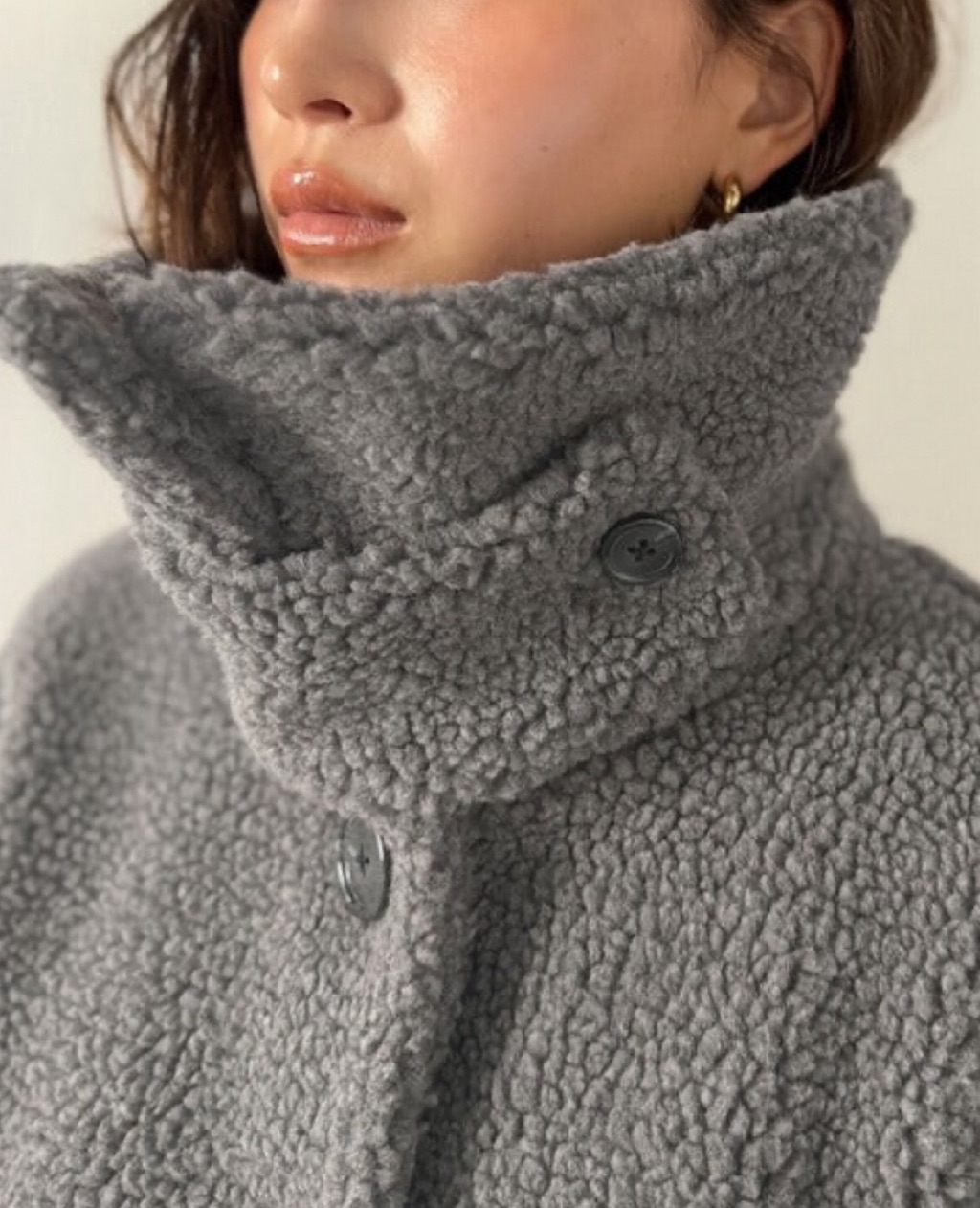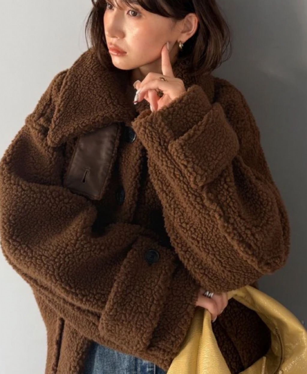 厚手の大粒ボアを使用した、大きめポケットつきショートブルゾン。
