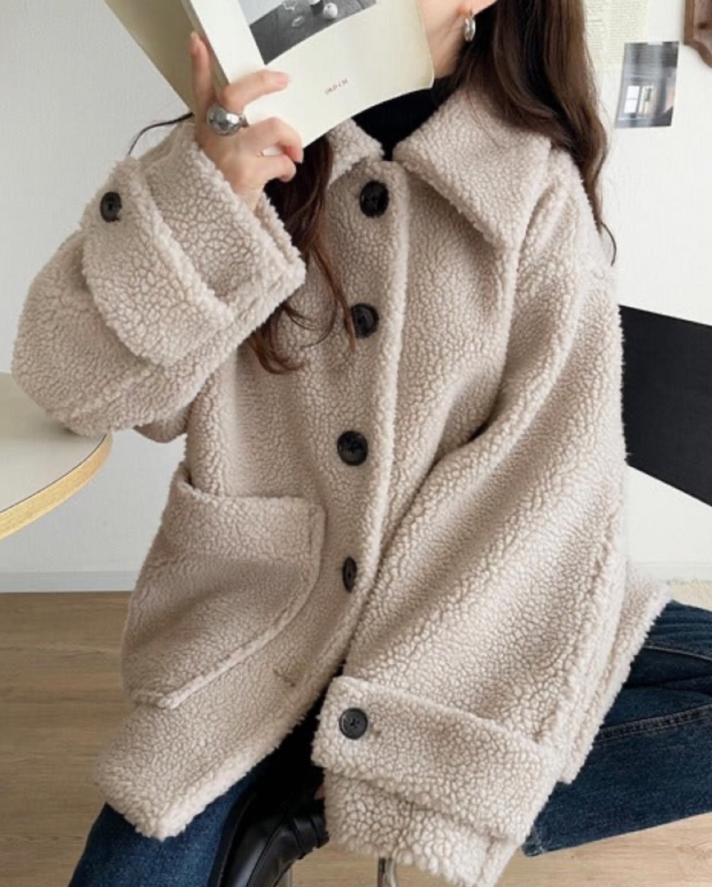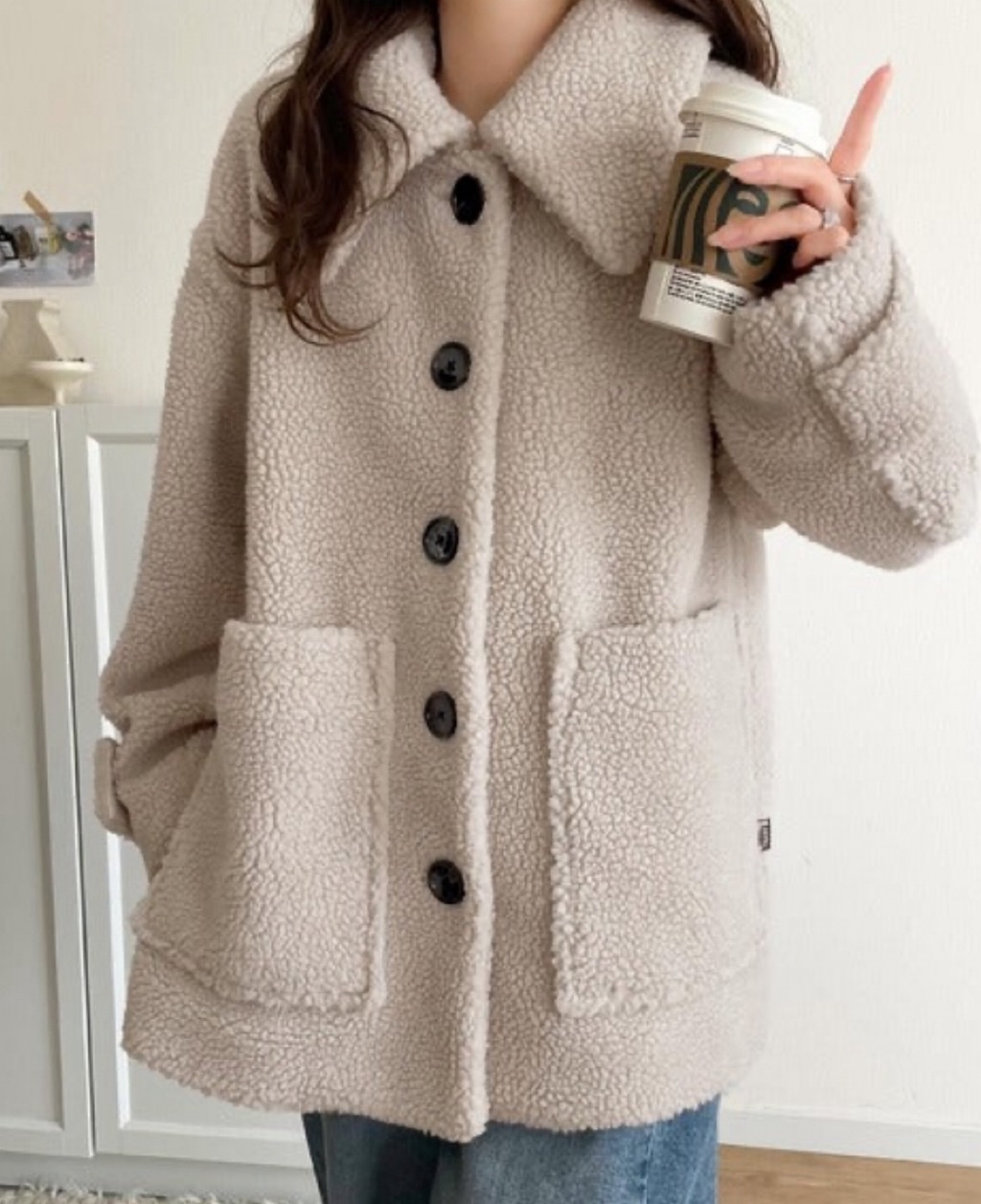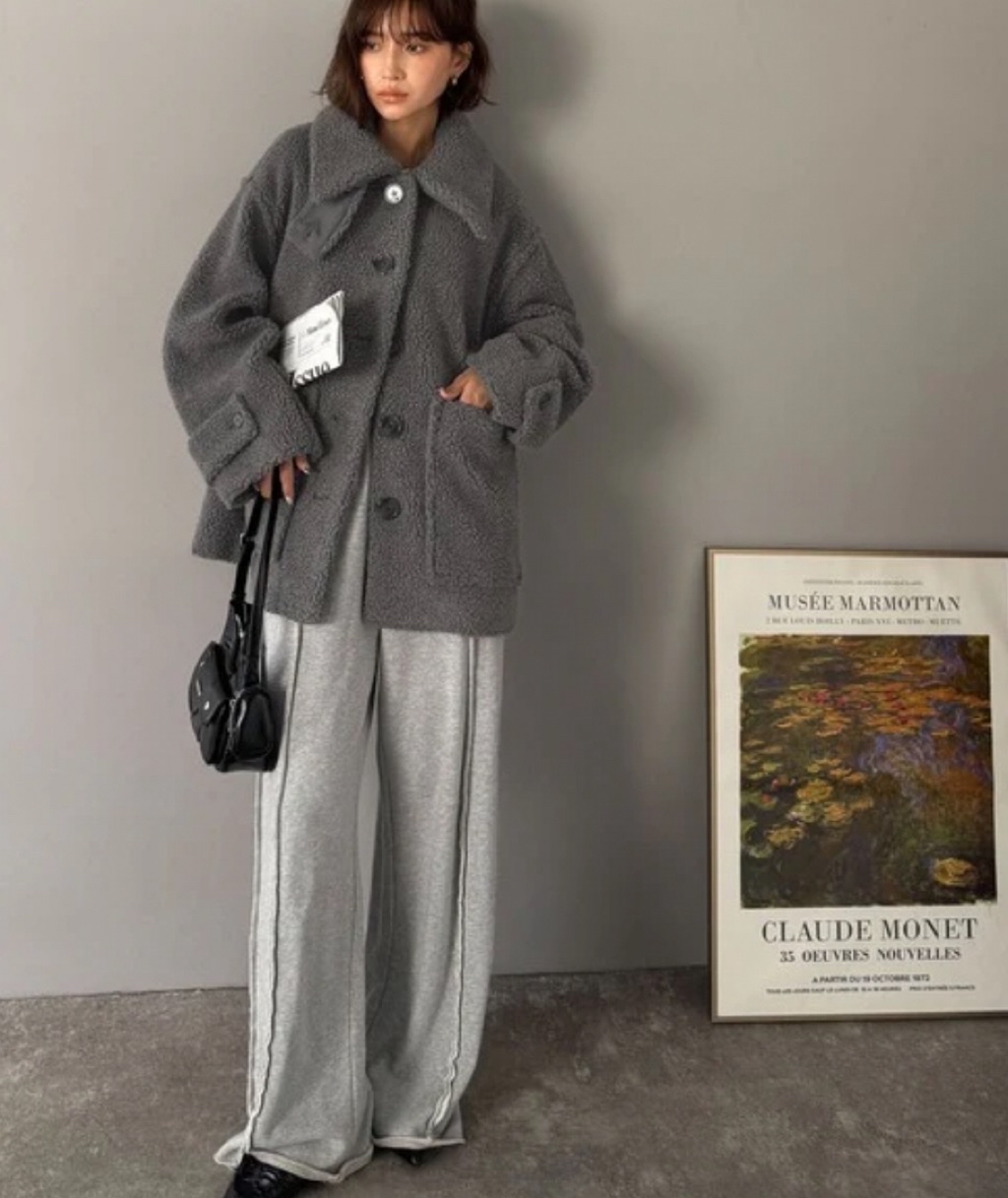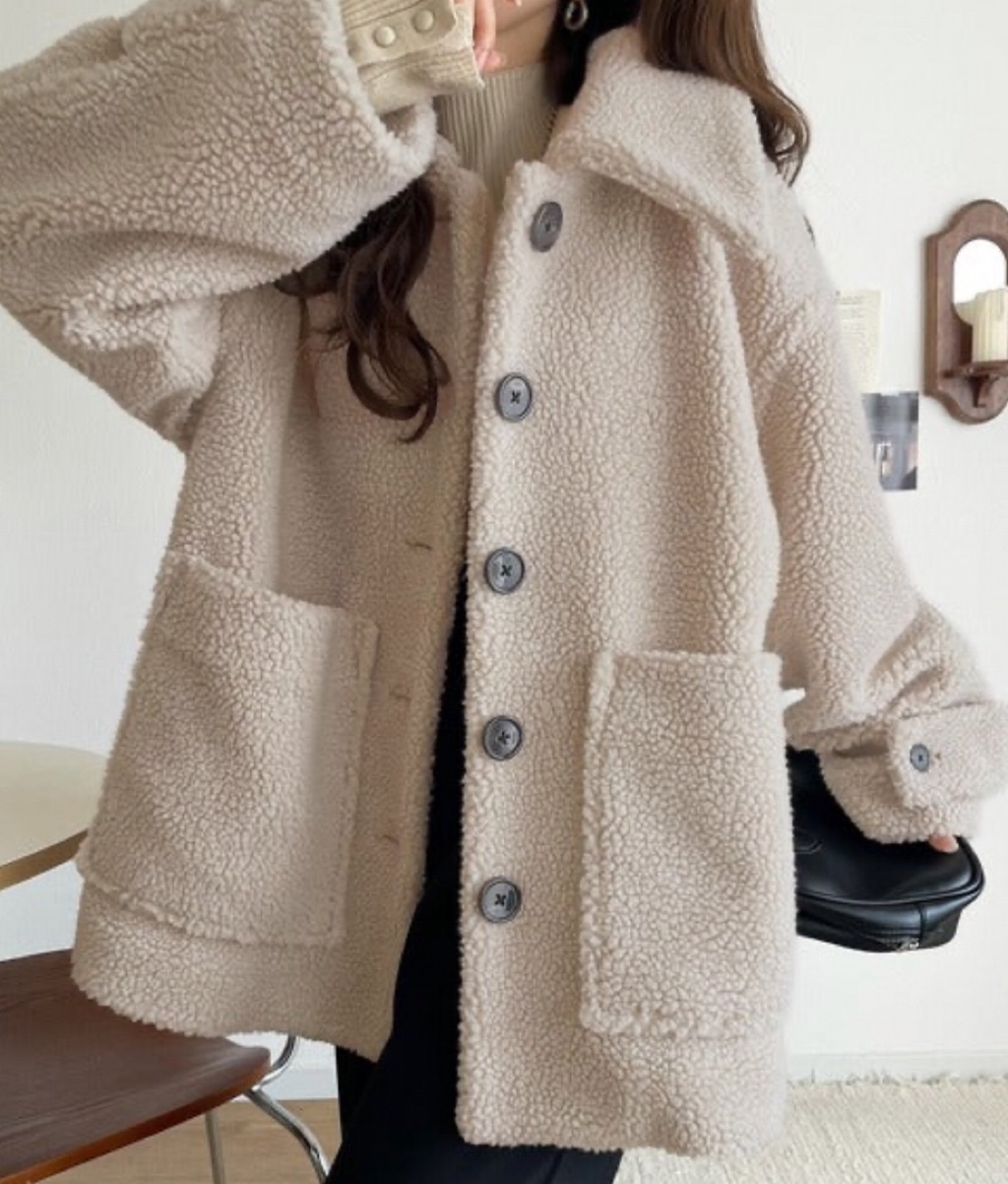 厚手の大粒ボアを使用した、大きめポケットつきショートブルゾン。