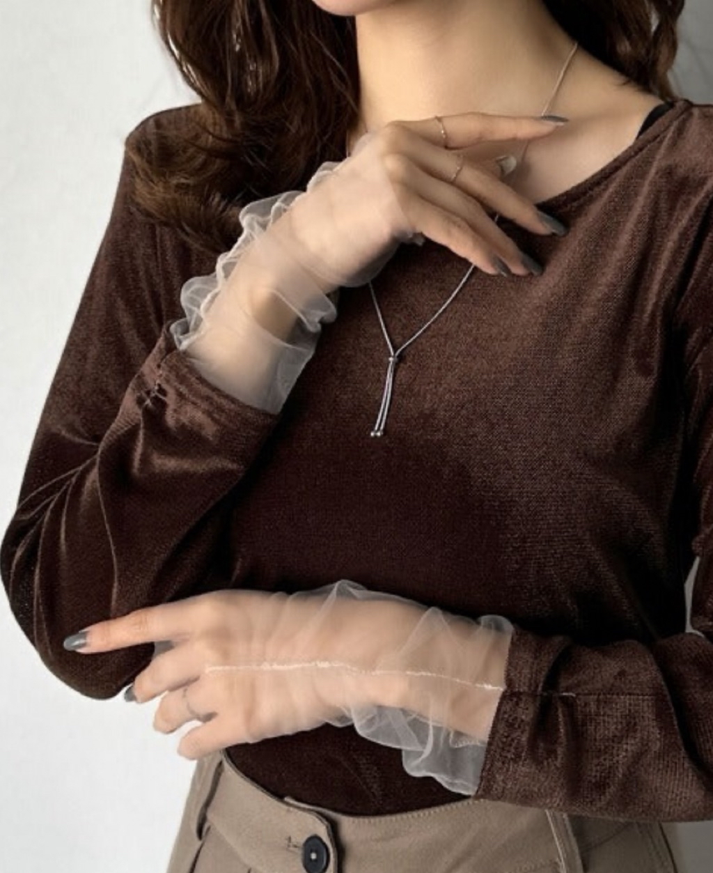 袖口的網紗抽皺拼接設計搭配薄紗絲絨,為造型增添亮點◎