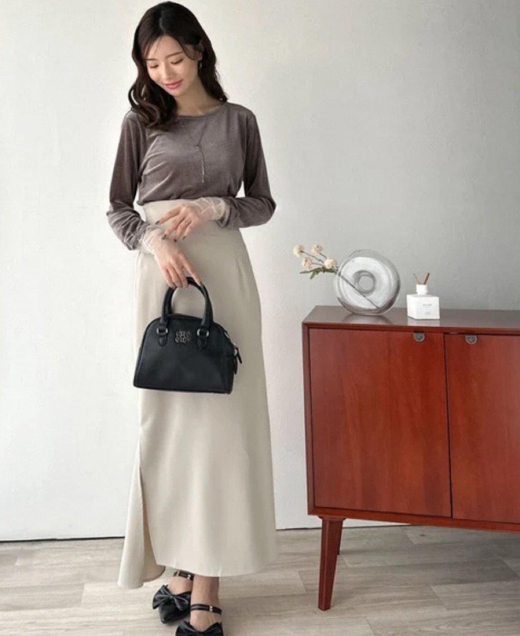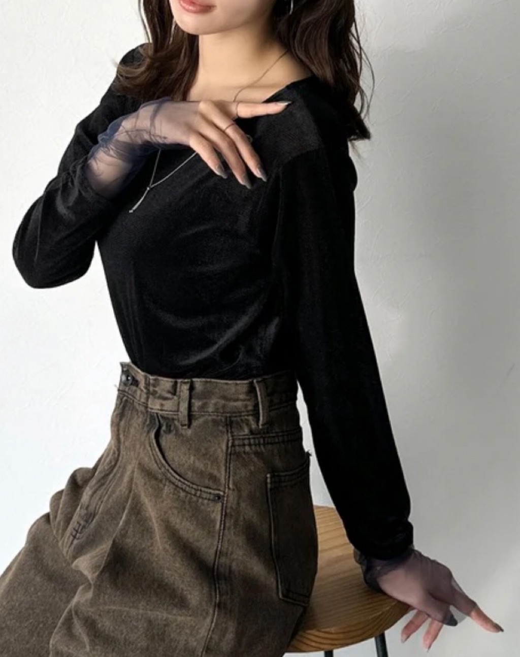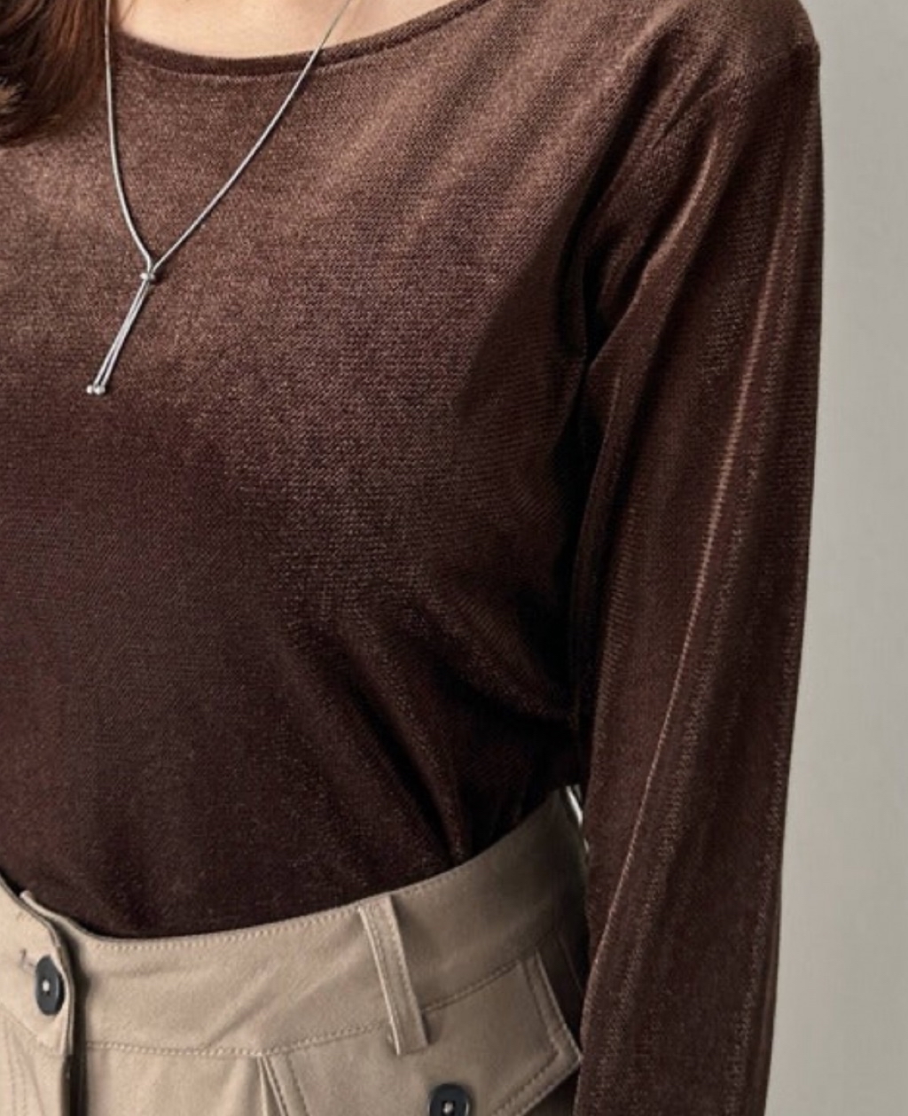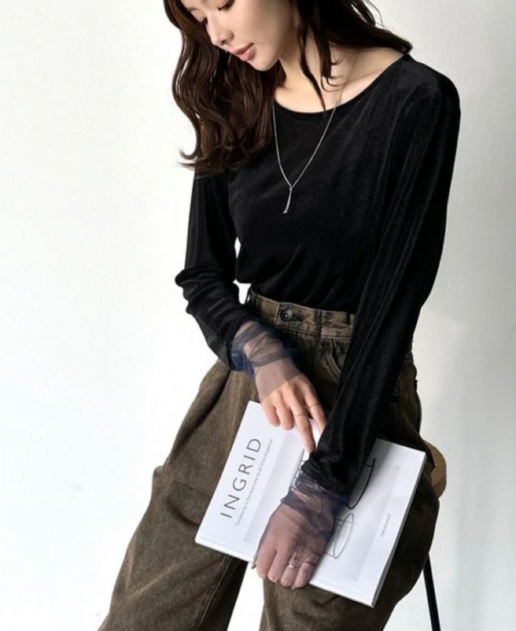 選用具有高雅光澤與微透視感的薄紗絲絨製成,單穿就很吸睛的套頭上衣。